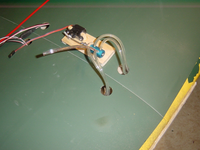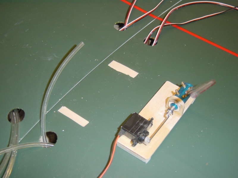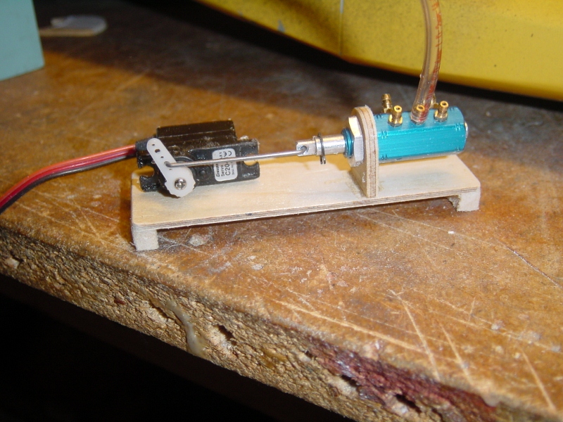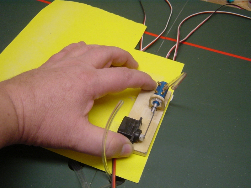 Monterat ventil och servo för stället på en liten plywoodbit.