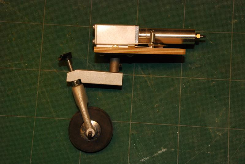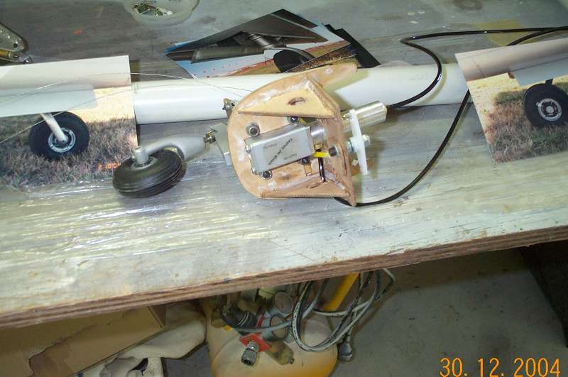 Jag har gjort en fästplatta av plywood som jag satte dit ett hemmasnickrat "roderhorn" på. Roderhornet består av en bit kretskort inköpt på favoritbutiken Kjell. Som ni ser är det tajt under cylindern, men det verkar som om det kan funka.