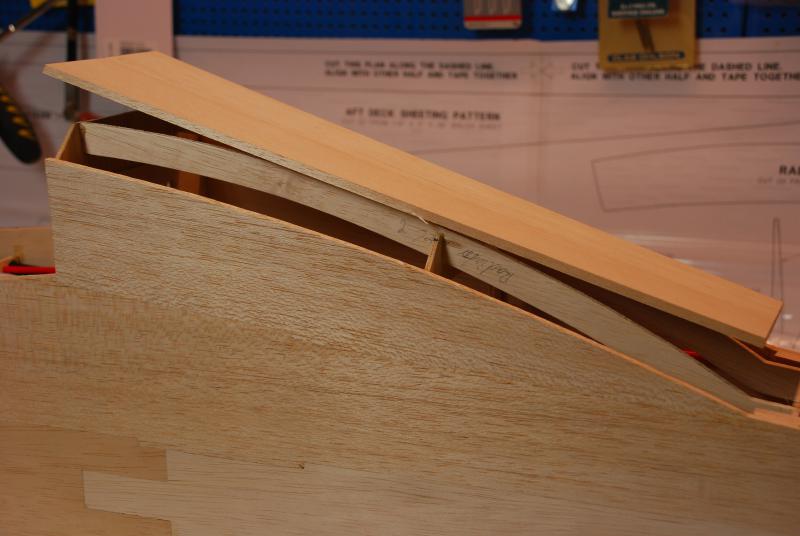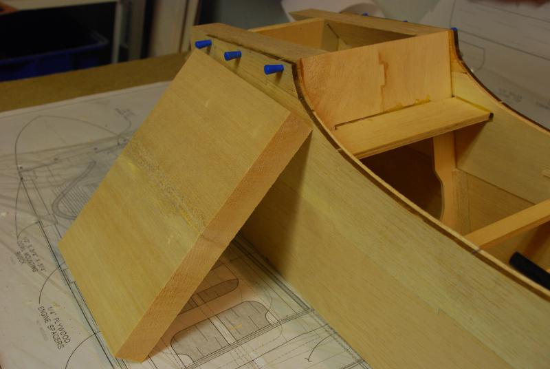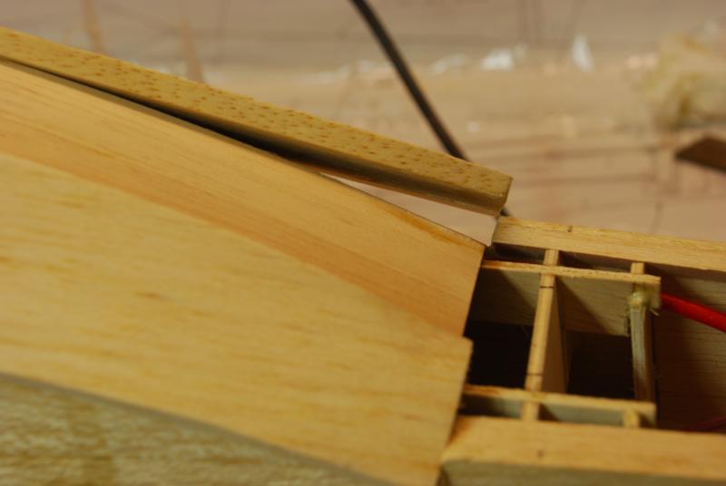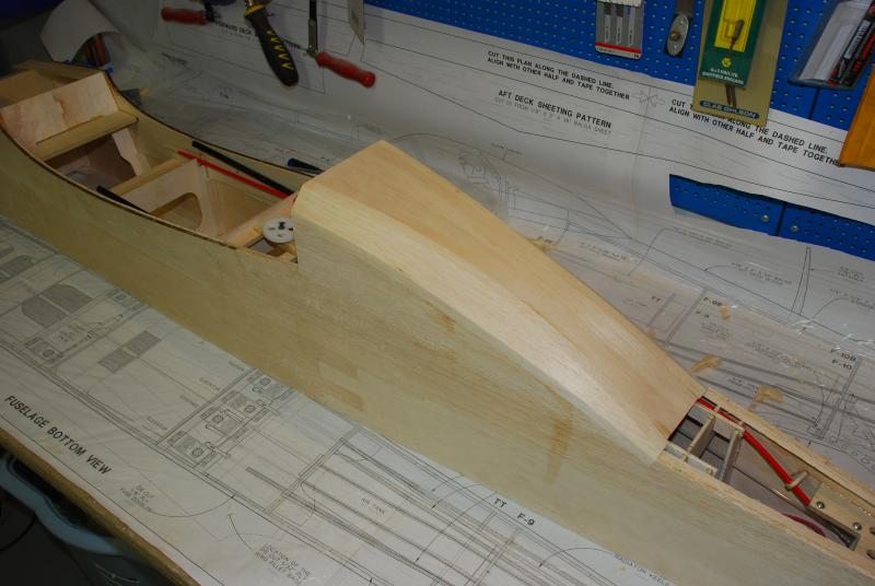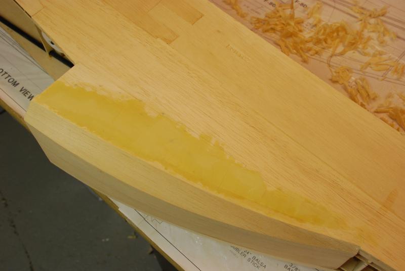 Nu har jag limmat klart den aktre undersidan så här långt. Tyvärr var jag lite för stark så jag tryckte in ena sidan mellan spanten. Det var synnerligen klumpigt av mig då jag redan under slipande såg att sidorna flexade ganska lätt. Jag limmade först på en bit balsa och därefter blev det balsaspackel. Det är tur att den inte ska klarlackas.:sarcastic:När spacklet är torrt och slipat tror jag att det blir OK.