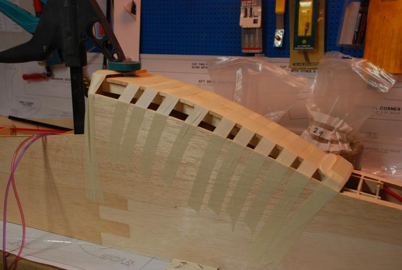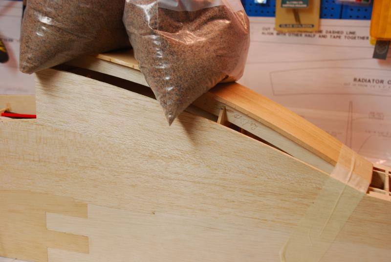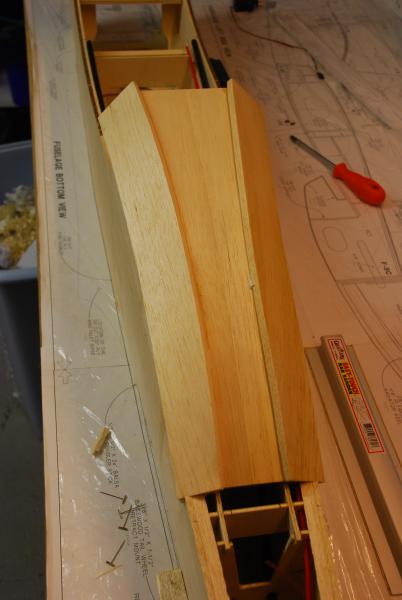 Nästa steg var att börja klä underdelen av bakkroppen. Den ska plankas med 4,8 mm balsa! Snacka om rejäla grejer! Men, den är ju inte helt smidig att kröka. Efter massor med sågsnitt på insidan och lite fönsterputs verkar det funka. Nu ska den få torka så får vi se om den kan limmas i morgon