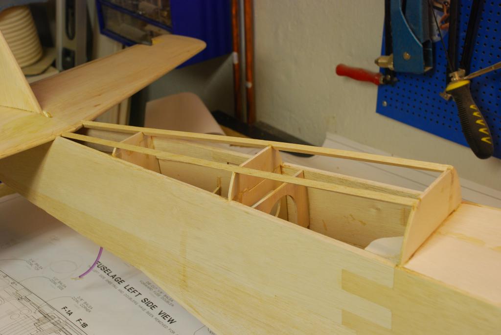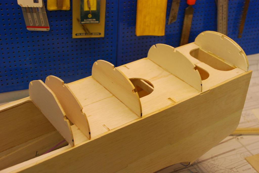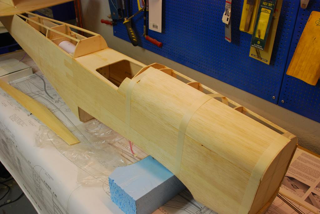 Nu har jag börjat med den övre delen på kroppen. Alla spant är på plats och jag har skurit ut balsan som ovansidan ska plankas med. Den främre delen är dubbelkrökt vilket gör att den är lite besvärlig. Jag har fuktat plankningen med fönsterputs och nu får den torka och formas på plats innan jag putsar till det sista och limmar fast den.