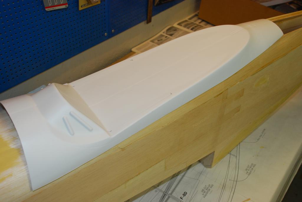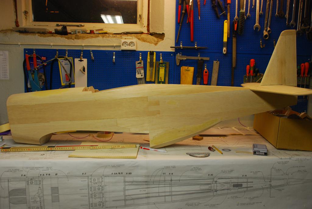 Nu är det bara en liten fyllnadsbit som ska limmas fast på kroppen innanför höjdrodren. Sen är jag klar där bak för ett tag. Då kan jag äntligen börja med överdelen av kroppen.