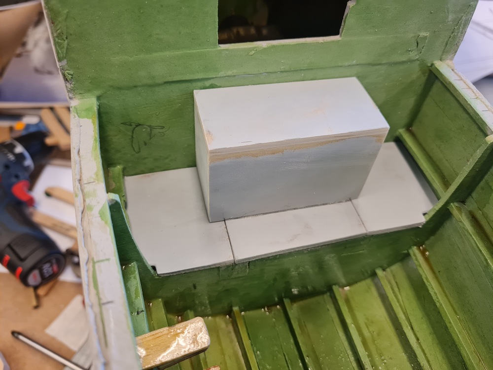 Lådan fastlimmad på mittendelen. Lådan kommer att döljas av nosskytten som kommer att bli av med en del av sin rygg för att få plats med lådan.
