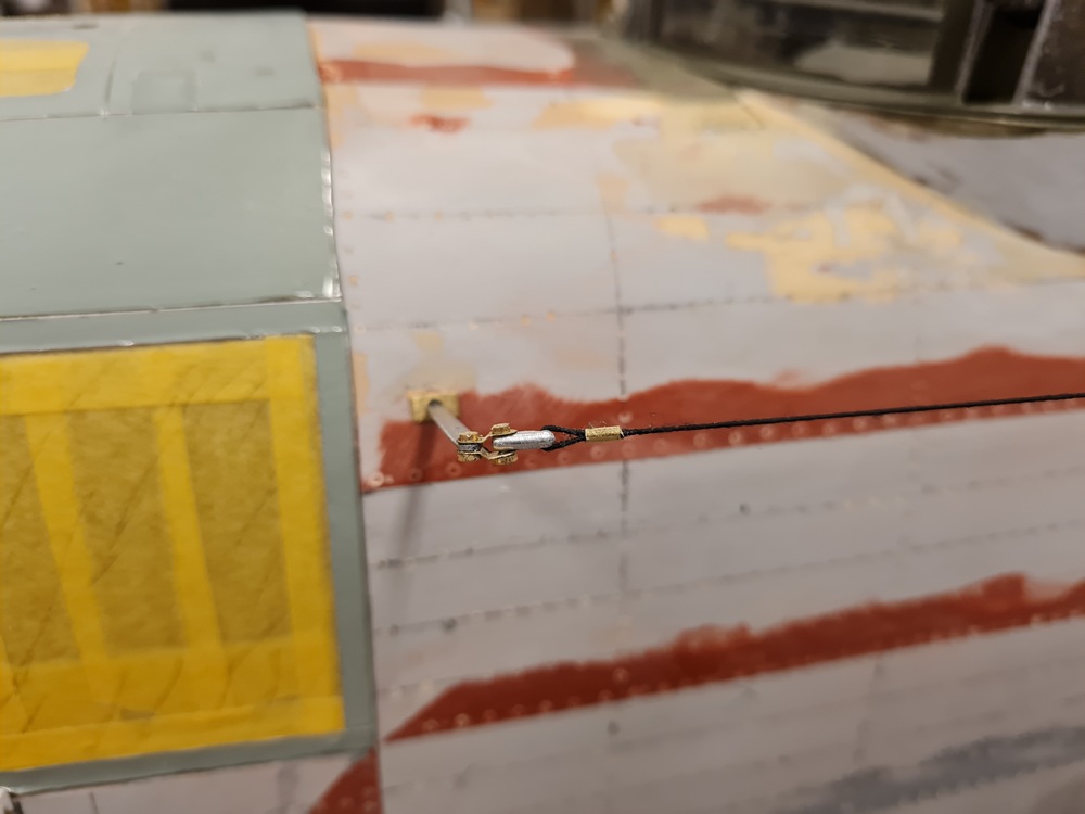 Vänster sidas antennvajer fästes vid antennmasten framme vid cockpiten.