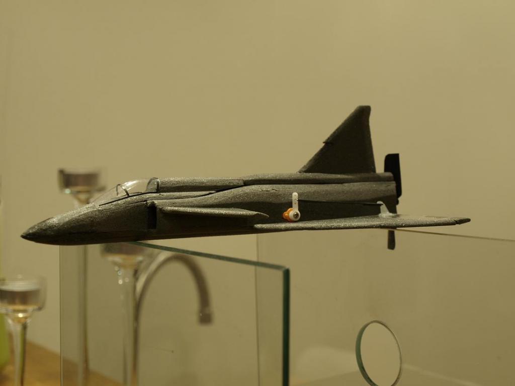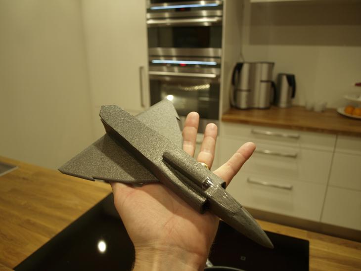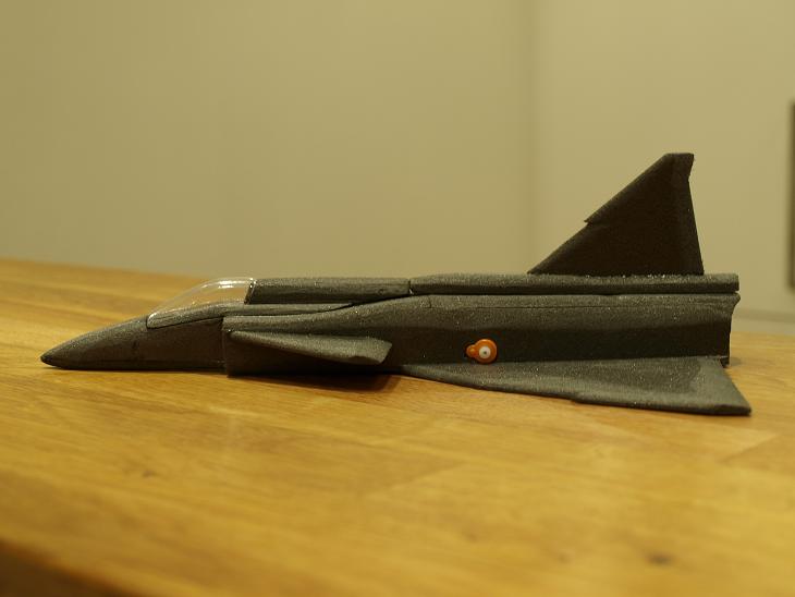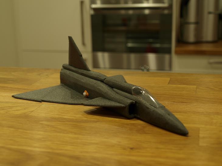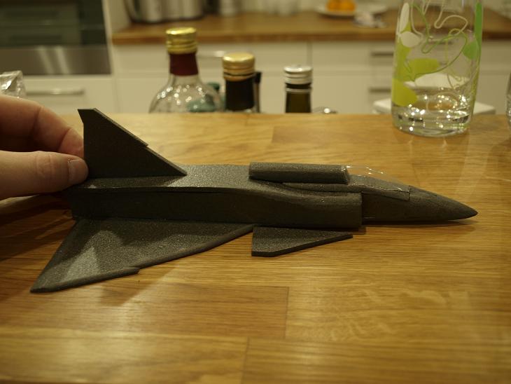Nu börjar det ju faktiskt se ut som en viggen. En del finlir är ju kvar och så funderar jag på hur jag skall göra med undersidan. Jag tror att jag håller mig till ursprungsplanen och gör ett lager med depron i mitten som slipas ner rejält till en rundad form trots att det väger lite. Det är ju inte snyggt med en helt platt undersida.