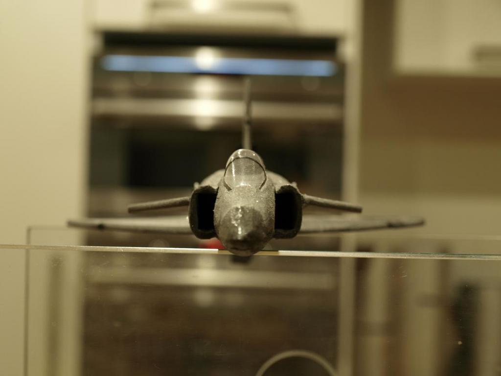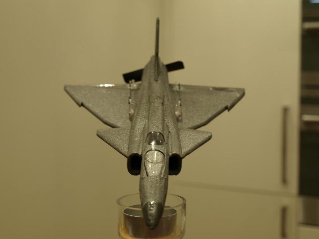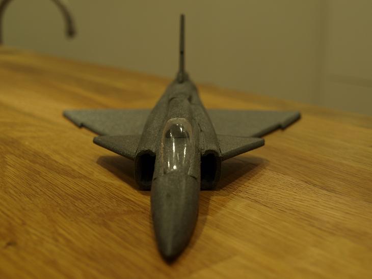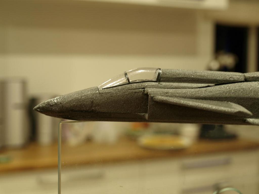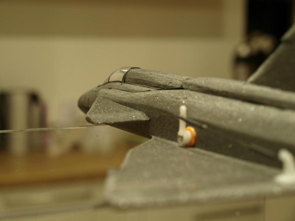 Nåja. Istället för att klura mer på det byggde jag vidare lite igår kväll. toppen på bakkroppen sattes dit temporärt så jag kunde runda av den lite och fixa till ryggåsen. Även canarderna och fenan kom på plats.