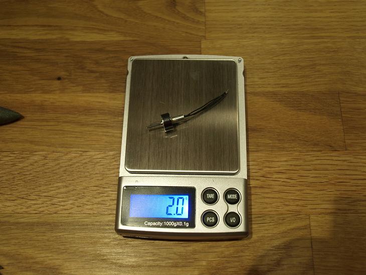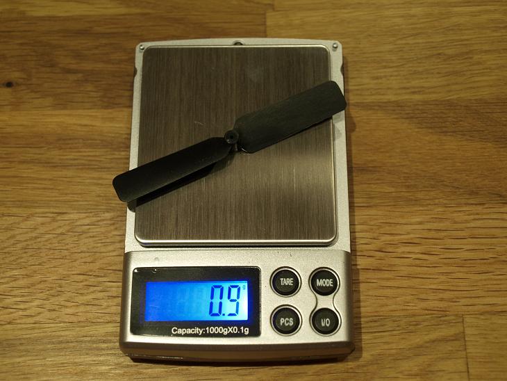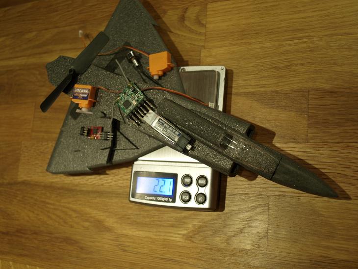 22g än så länge. Då saknas lite detaljer men samtidigt är det mycket som skall slipas bort. Under 25g bör vara rimligt. Enligt specen skall motorn lämna 36g+ dragkraft vid 1,5A men det lär den inte göra. Jag tror på ca. 20g och jag hoppas att det skall räcka för att hålla den i luften.