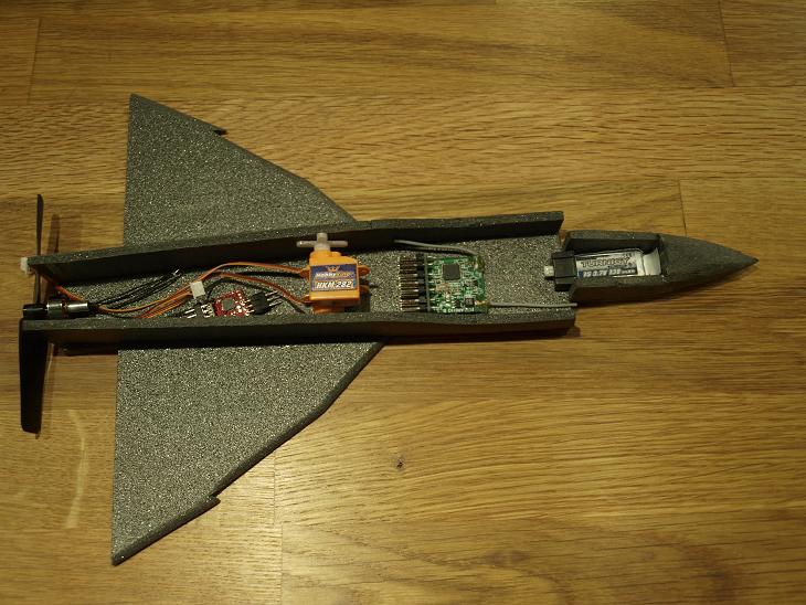 Ungefär såhär tänkte jag mig att layouten kunde se ut. När jag postat detta skall jag se om jag kan hitta var CG skall vara så jag kan bestämma mig för var jag skall placera elektroniken. Eftersom servona är ganska tunga (i sammanhanget alltså) Så får CG avgöra var de skall hamna. Jag kommer skära hål för den i kroppssidan när jag vet var de skall sitta. Acken kan jag tyvärr inte flytta så mycket när väl modellen är klar. (Detta är prototyp nr1 som kommer att få agera kastplan till grabben)