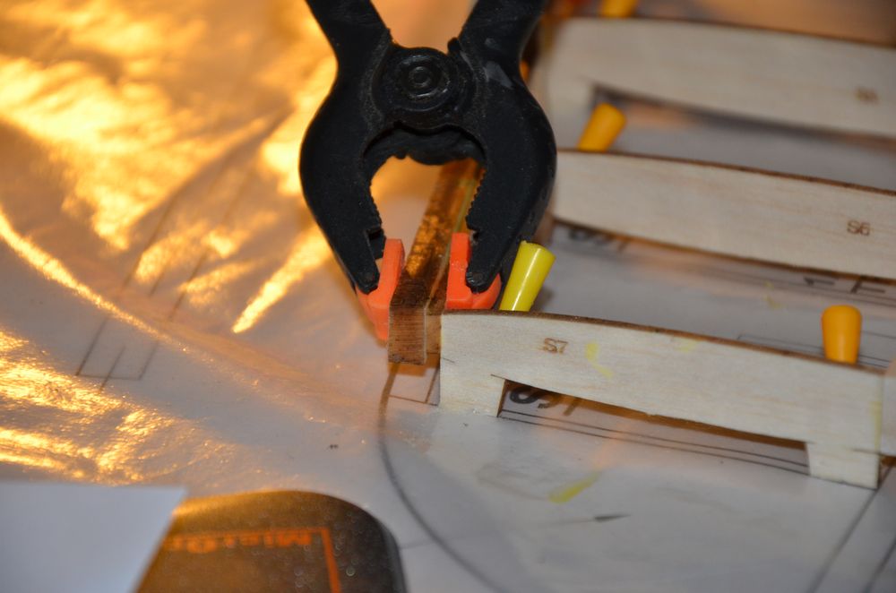 Gårdags kvällen blev tyvärr inte som det var planerat. Tanken var att planka ovansidan av stabben så fort ett pilothål hade tagits upp i extra spryglarna, samt att spryglar #4 limmats på plats.
