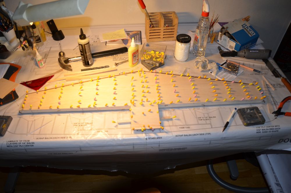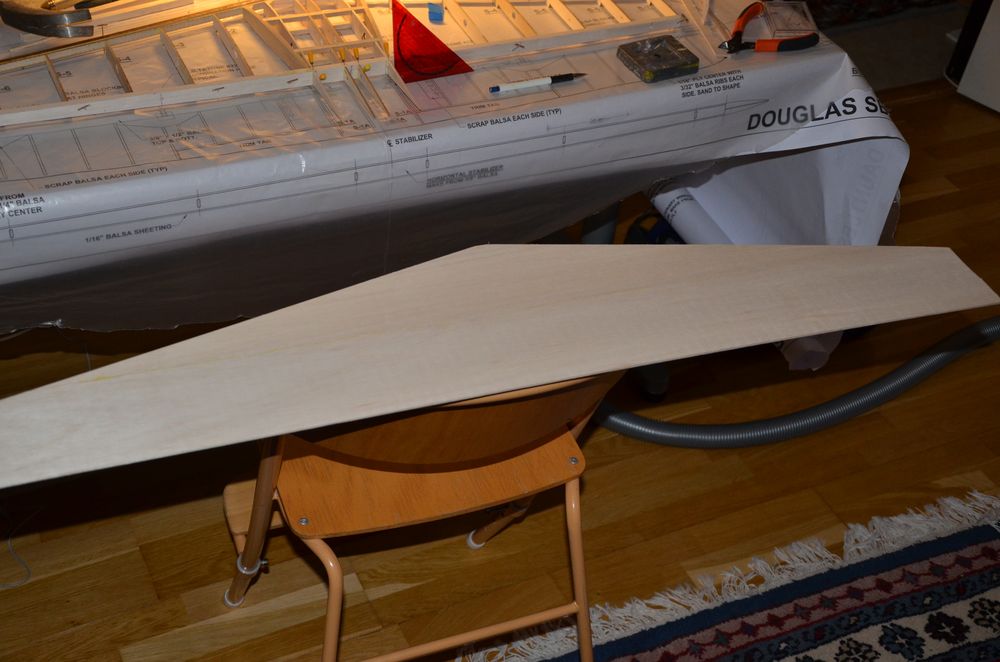 Kommer troligtvis börja med höjdrodren när limmet till plankningen torkat och det går att ta bort den från bordet. Känns som att det skulle vara bra att ha med dom innan fortsatt plankning.