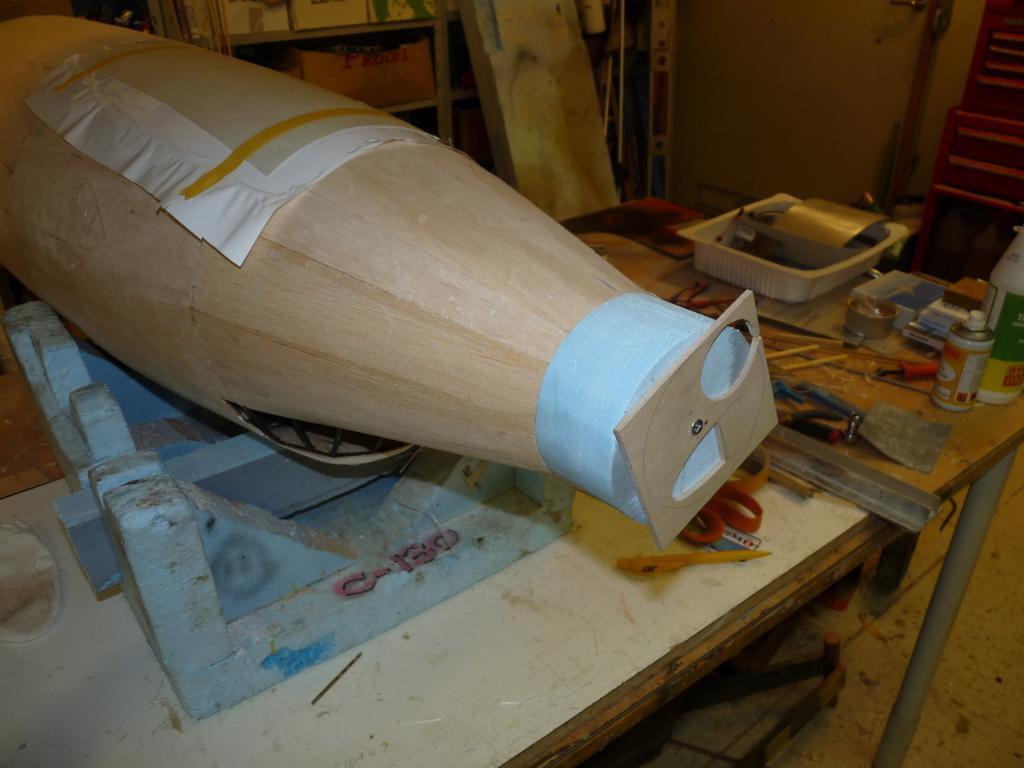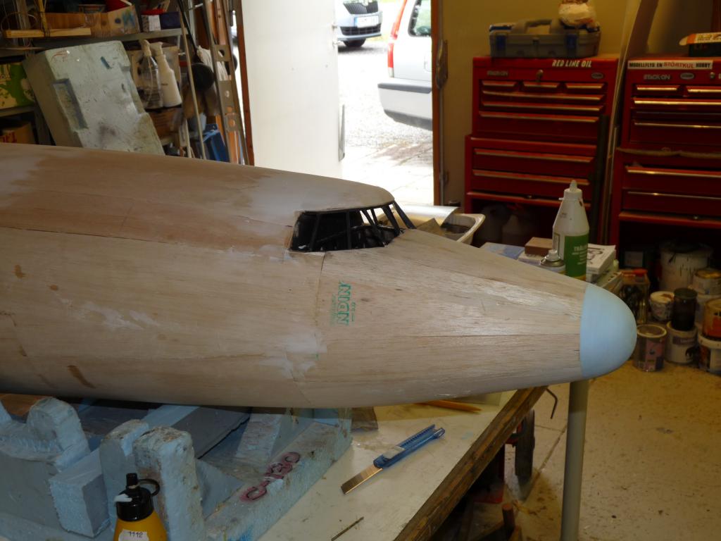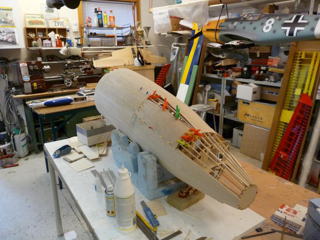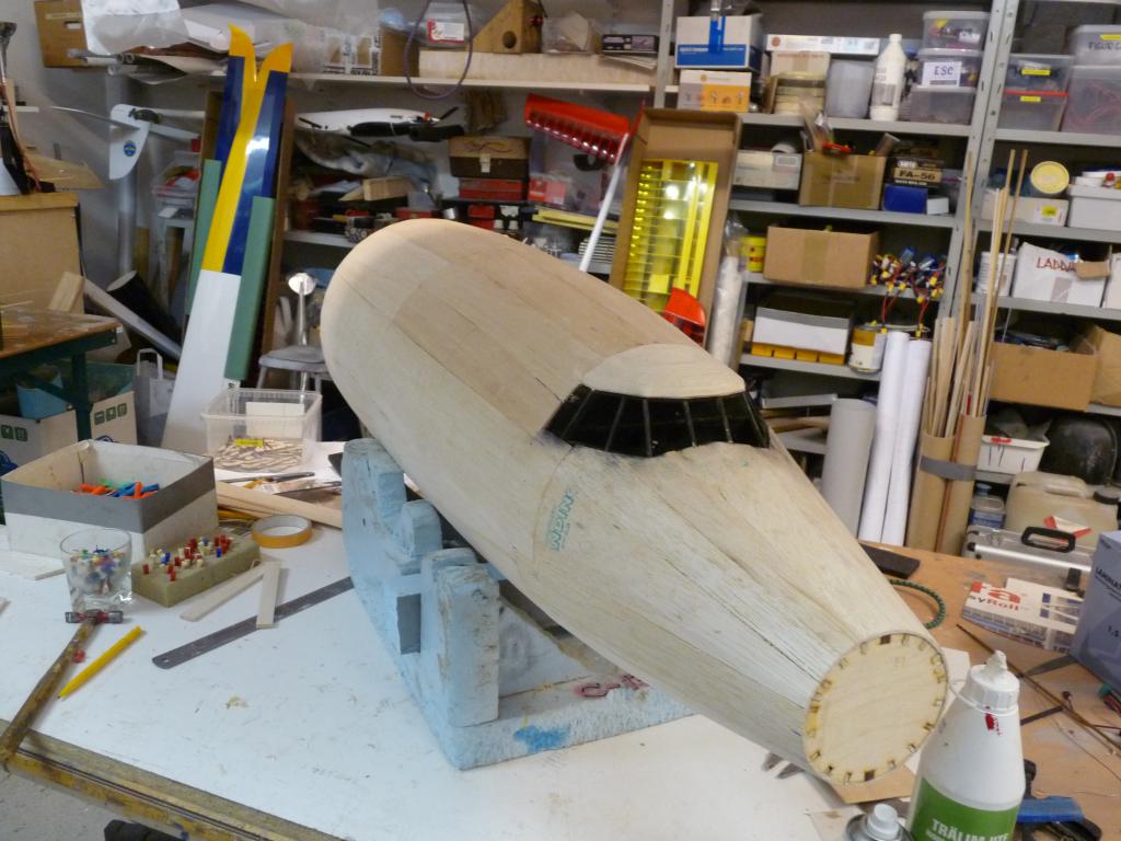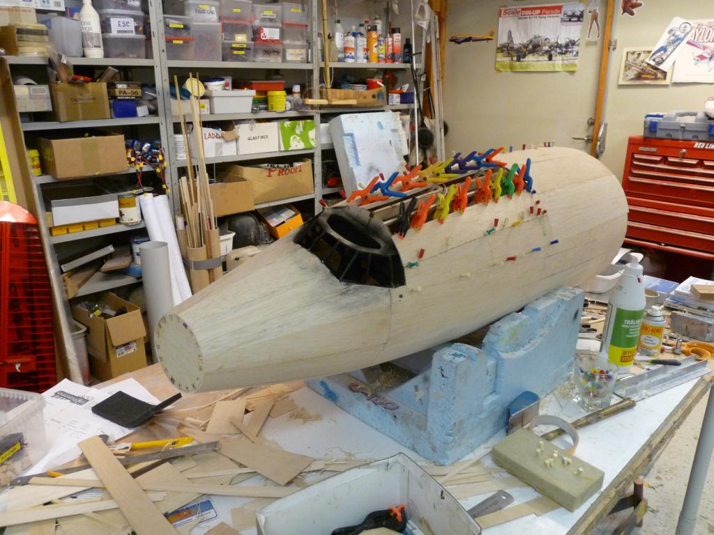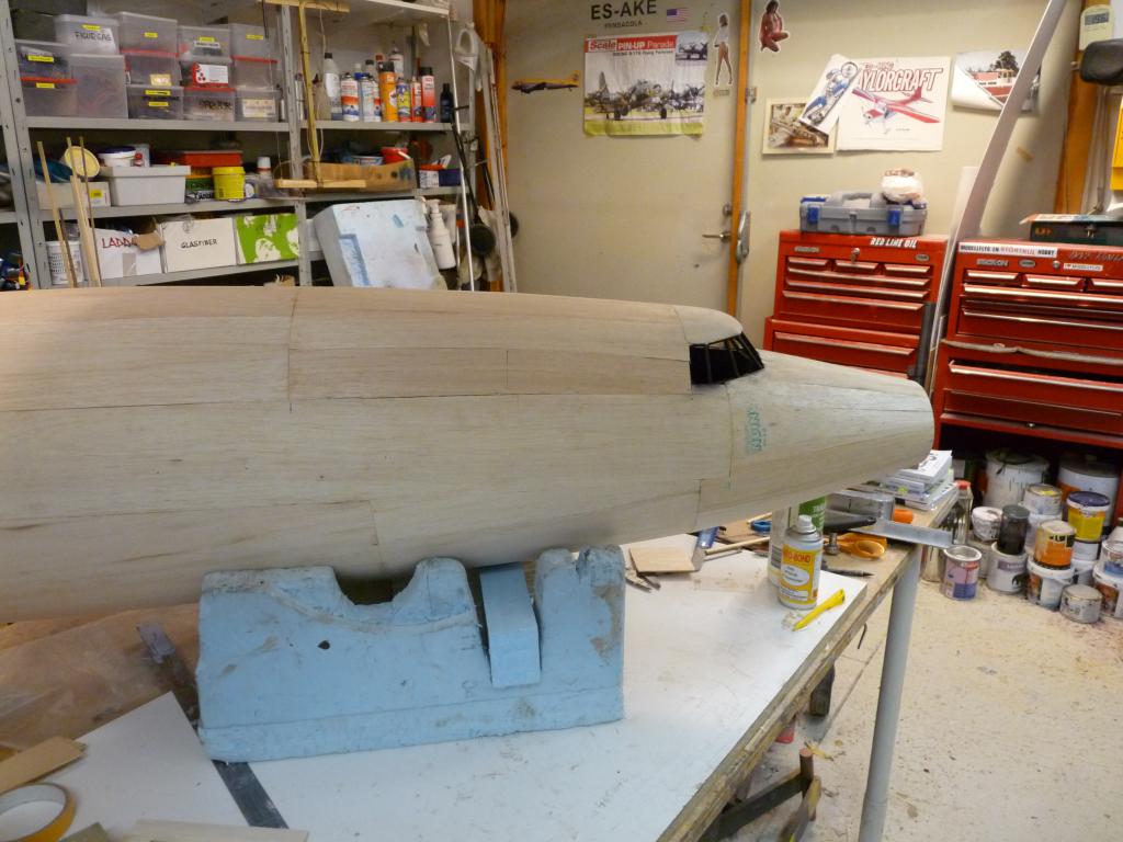-Plankningnen av nosdelen börjar nu se sitt slut,kan inte ha gått åt mer än några kvadratmeter balsa bara..