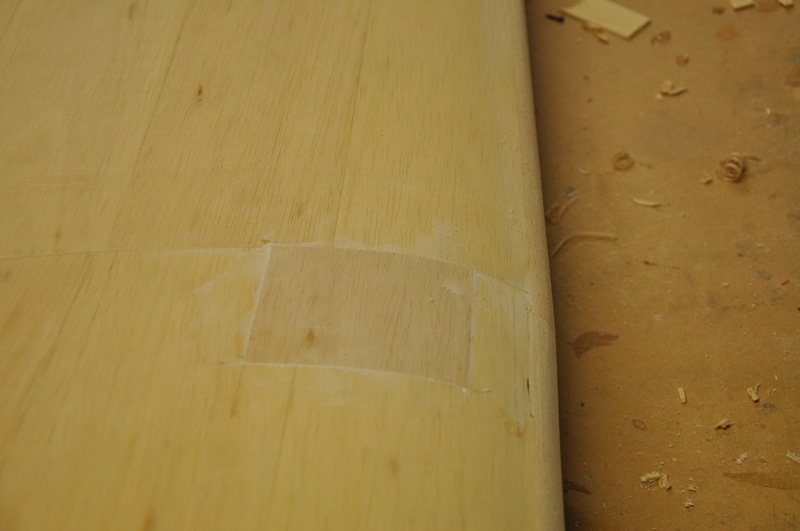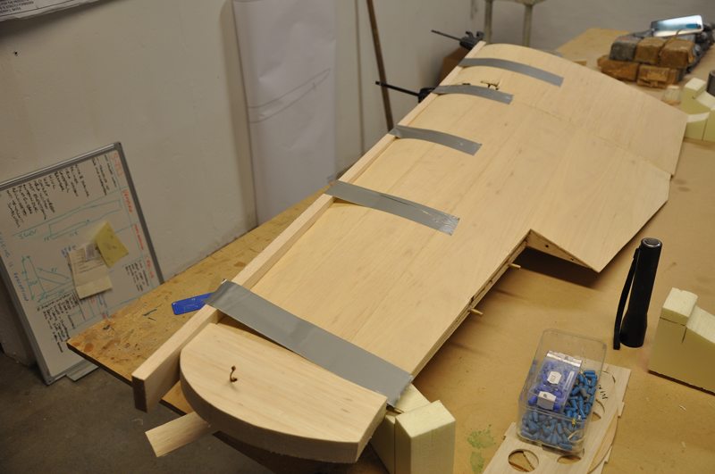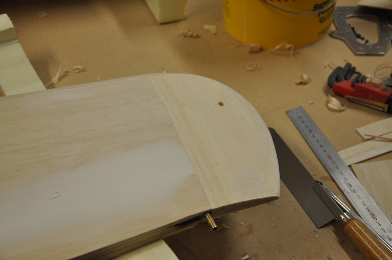 Jag tänkte prova ett nytt sätt att fylla ut skarven mellan kroppen och vingarna. Först limmar jag fast mjuka balsalister som ligger mot kroppen.