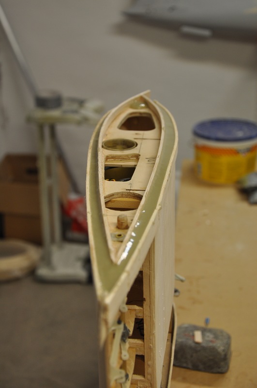 Därefter bygger jag upp en sarg ca 10 mm innan för de andra balsalisterna. Utrymmet mellan dem fyllde jag ut med epoxy blandat med mikrofibrer. Det här skall bli intressant att se om det fungerar som det är tänkt.