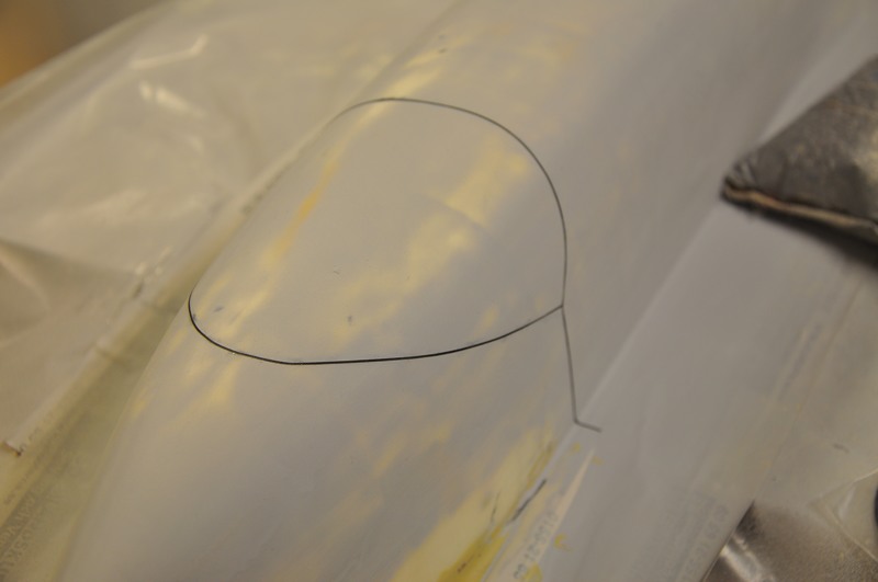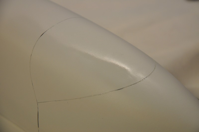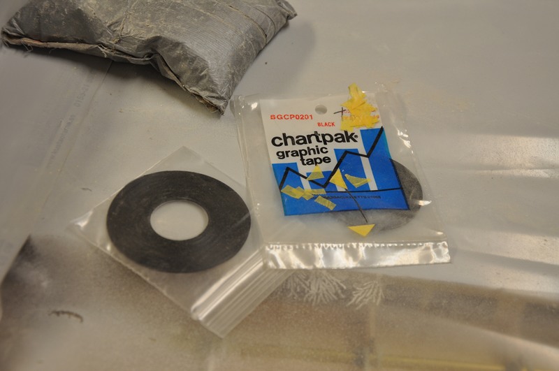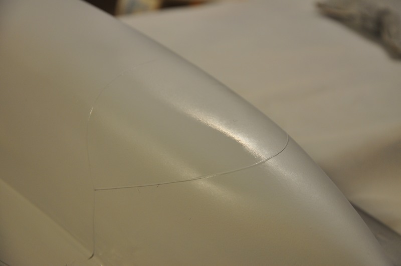 När spacklet var färdigslipat så var det dags för att lägga på lite 0,64 mm bred tejp över linjerna där kåporna skall delas isär bak vid hjulet. Kåporna skall även delas upp i framkanten, men jag vet inte riktigt var just nu, så det får vänta.