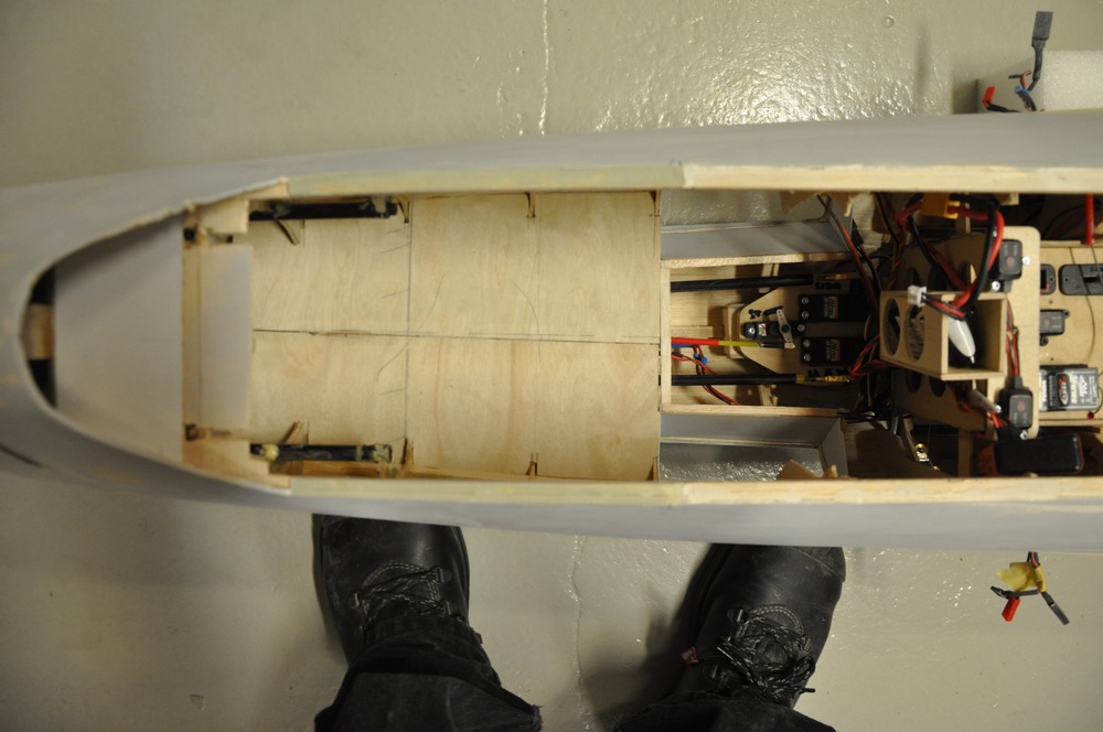 Nästa steg var att klä golvet med 0,25 mm tjock styreneplast från Evergreen. Det blir en slät och fin yta. Den delen av golvet som finns ovanför höjd- och sidorodernas servon är löstagbar så jag kan komma åt dessa servon.