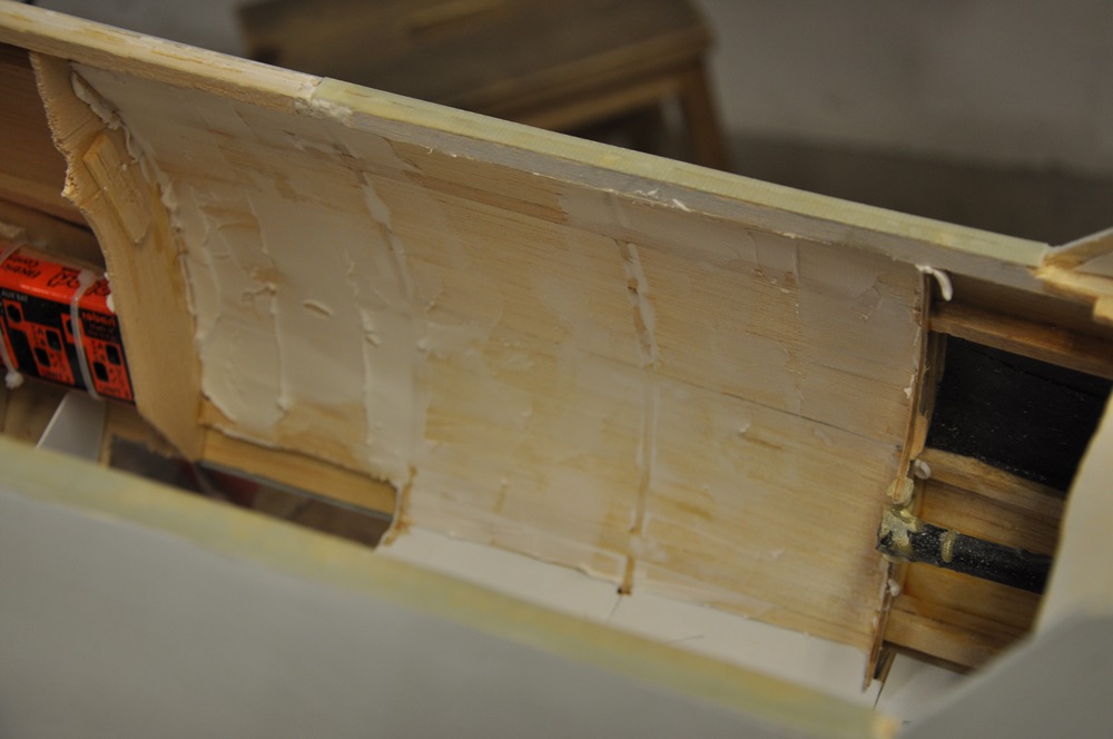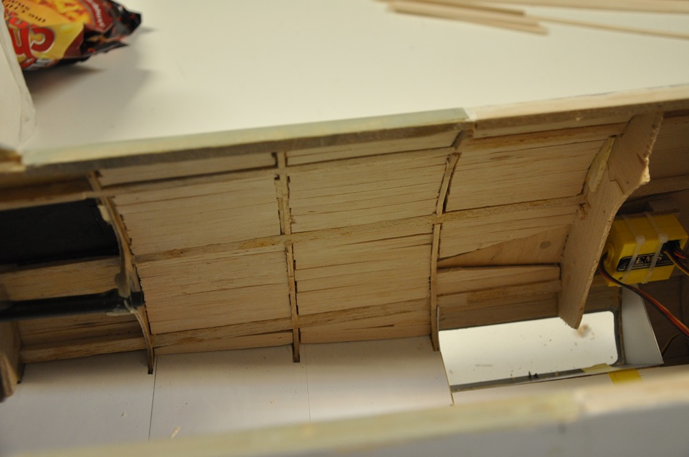 Spanten och longerongerna slipades ner så de får samma höjd som balsan som jag limmade in mellan spanten. När spacklet torkat så skall alltsammans slipas till en jämn yta.