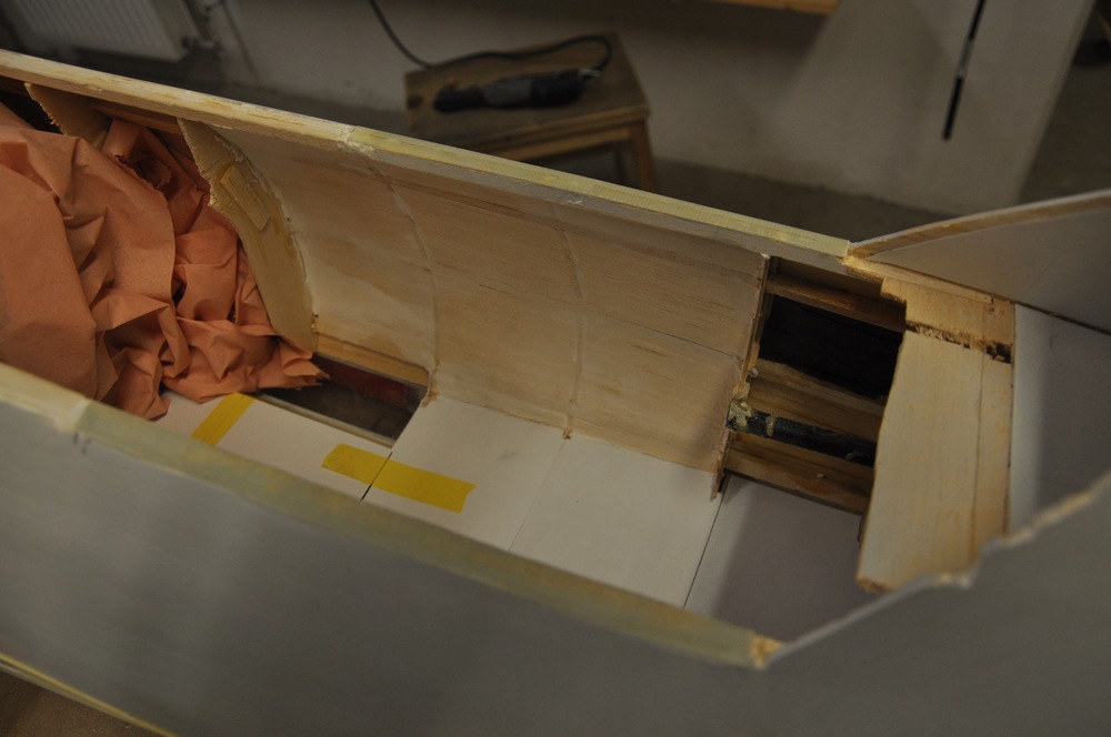 Nästa steg är lite mer tidskrävande. Väggarna skall också kläs med styreneplast för att bli släta och fina. Så det var bara till att fylla ut utrymmena mellan longerongerna och spanten med väldigt lätt balsa. Allt detta skall slipas till en jämntjock yta.