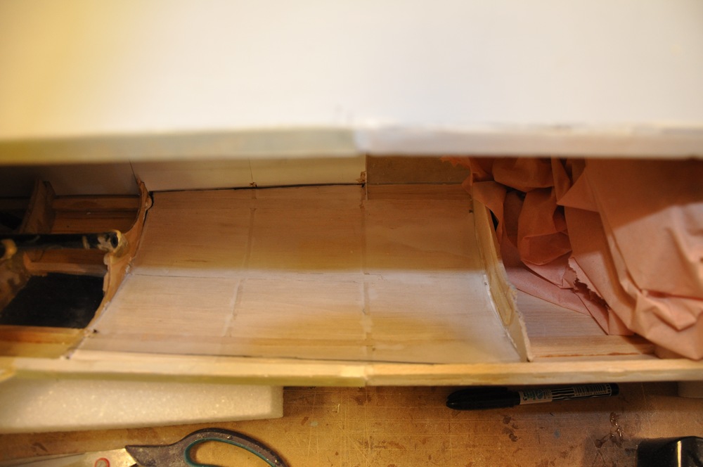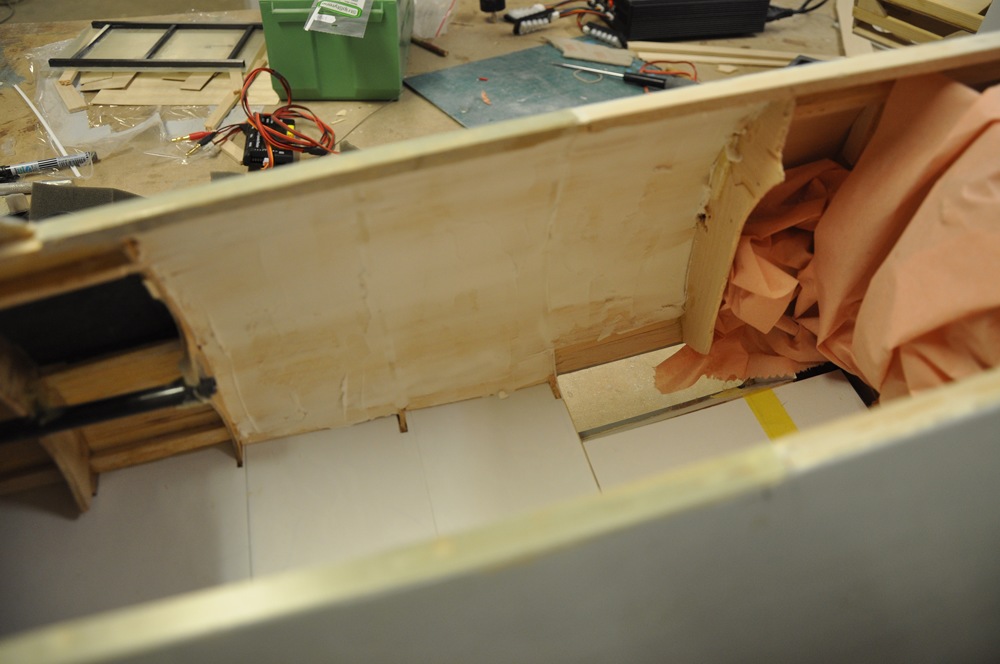 Det behövs givetvis ett golv där bak hos spanaren. Det första som kapas och anpassas till flygplanskroppens form är två 0,6 mm plywood skivor.