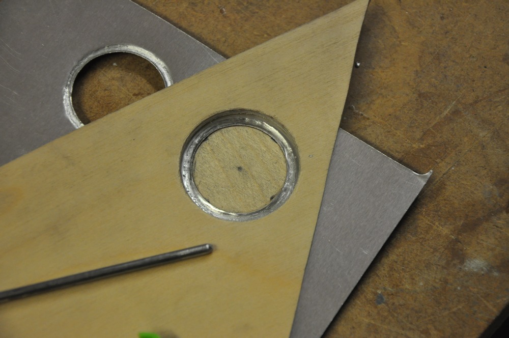 Med hjälp av jiggen under plåten, en plywoodbit ovanpå med ett lite större hål och en 3 mm pianotråd med rundad spets fick jag fram en bockning som duger.