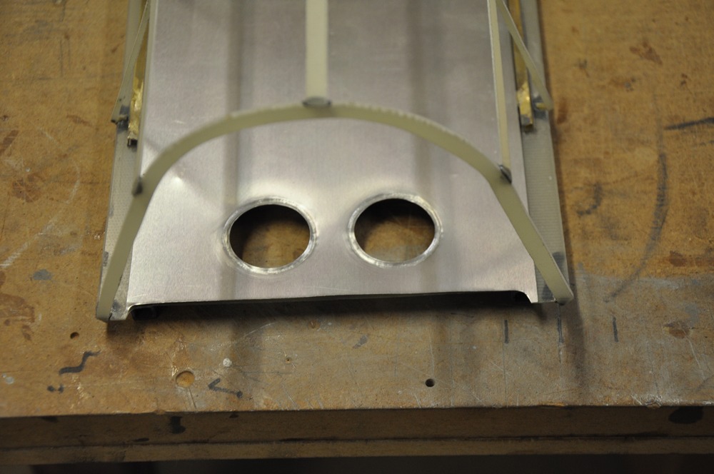 Ovanpå glasfiberplattan skall jag limma fast denna lithoplåt. Strax bakom piloten så finns det två stora hål. Så det var bara till att gräva fram hålen.