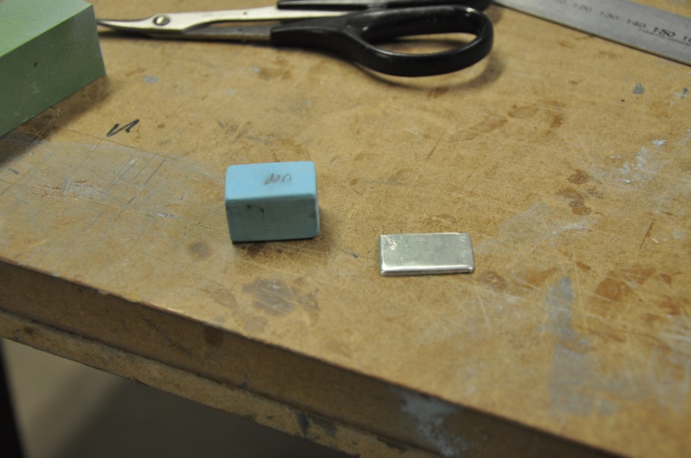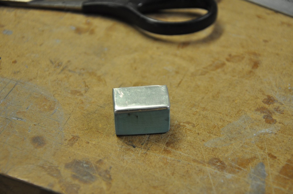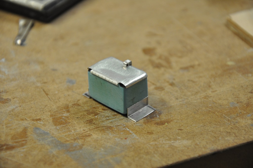 Lådan är 25x16x16 mm i skala 1/5. Locket till lådan var enkelt att "hamra" fram efter att plåten hade värmts upp till lagom temperatur för att sedan få svalna helt innan formandet påbörjades.