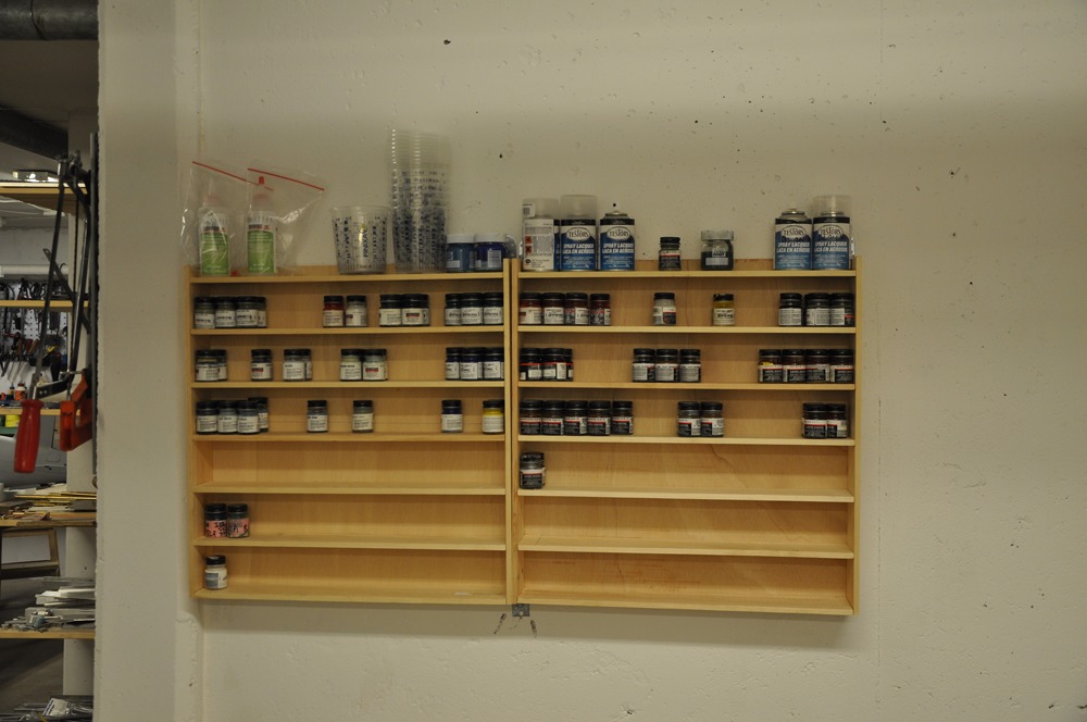 Jag tröttnade på att alltid behöva leta efter just den färgburken som jag behöver för stunden...så jag snickrade ihop två hyllor som rymmer 392 burkar...plus att jag har material för ytterligare 2 hyllor om jag skulle behöva fler...