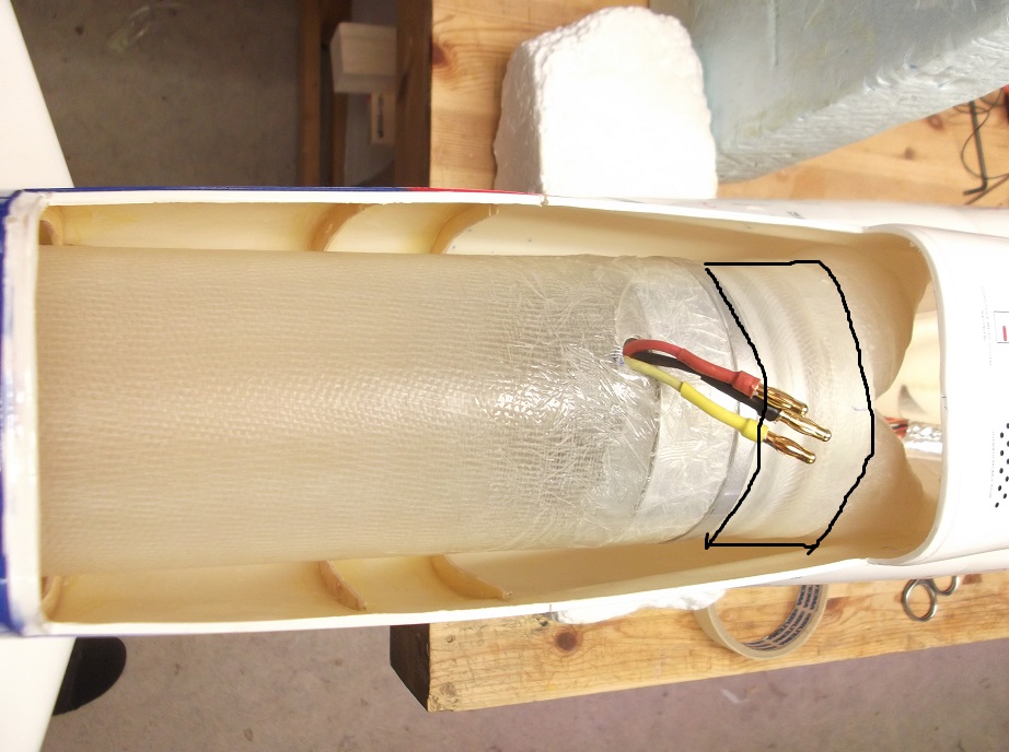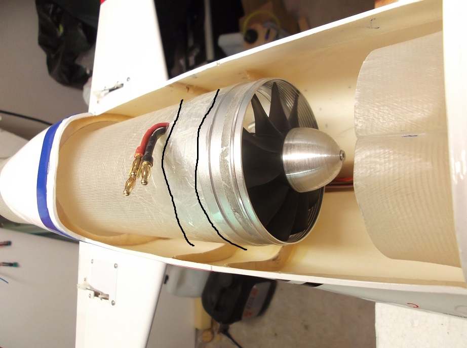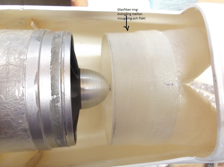 Också här kapade jag ca 20mm. Gjorde en ställning och fixerade fläkten, som fick lite plastfilm virat omkring kåpan. Ställde utlöbsduten ovanpå och virade en 5cm bred glasfiberremsa 3-4 gånga omkring duct och kåpa, genomblött med epoxy. Det blev kanon. Med fan-enheten på plats i utlöbsducten. Hål gjort för sladdarna, trycktes röret så långt bakut det gick. Övergång mellan Fan och inlöbsduct sker via en glasfiberring. Den blev nu limmat på plats med Hysol, och röret med fanen trycktes på plats och säkrades med tape, mens Hysolen härdar. Voila! På första bild, är den nygjutna glasfiberremsa markerat mellan två streck. Den andra bild viser inlöbsducterna innan glasfiberringen limmades på.