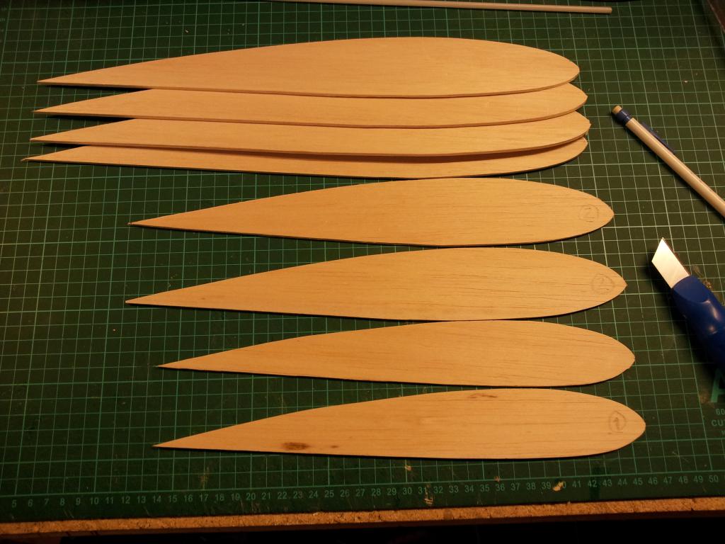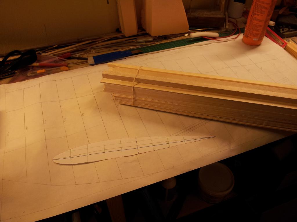 Idag var jag och köpte ett knippe balsaflak och lister och började på spryglarna till vingen.