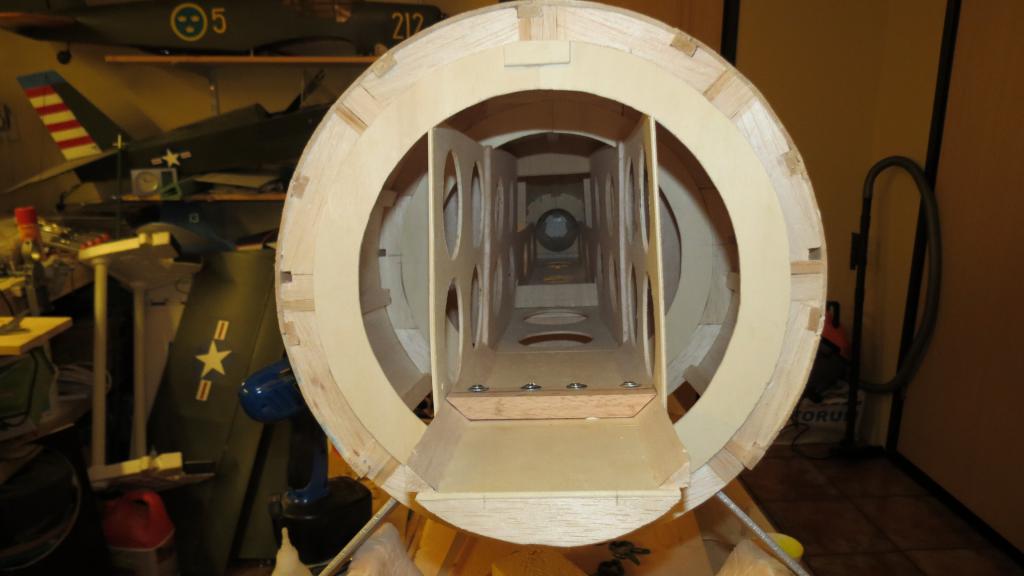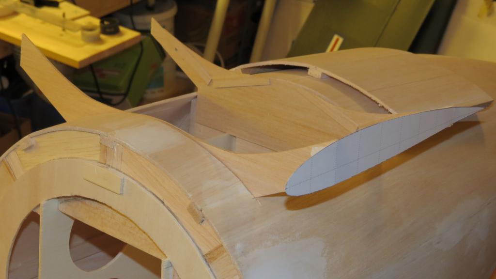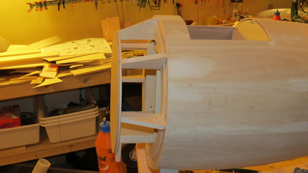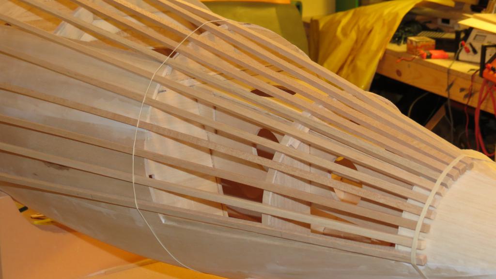 Skämt åsido men jag brukar faktiskt också, som Lasse skriver, planka med ribbmetoden. Det tar ungefär samma tid i anspråk men resultatet blir en stark kropp. Viktmässigt skiljer det inte något, bara man inte använder Wesses knep med 2x4 tums mahognyplankor! . Vissa krökningar klarar man helt enkelt inte av med hela flak och då måste man ta till stickor o strån för att inte stå där med sprucken plankning. Nackdelen med att använda hela flak är att man kan få fula insjunkningar i kroppen när balsan torkar och krymper tillbaka och då behövs en del onödig spackling. Detta kan hända även om man använder fönsterputs för jag har själv drabbats av det. Jag plankade en gång Mustangkropp med hela flak, fuktade med fönsterputs. Några dagar senare när balsan torkat, hade den insjunkningar som skulle kunna jämföras med en gammal ubåt som gjort en djupdykning till 500 meters djup. Visserligen kan man behöva fukta ribbor också om det är riktigt skarp böjning men det drabbar ju inte hela ytan och man kan låta den fuktade delen på ribban torka innan man drar på nästa. För man måste ju inte fukta hela ribban bara för att den ska krökas i ena änden!