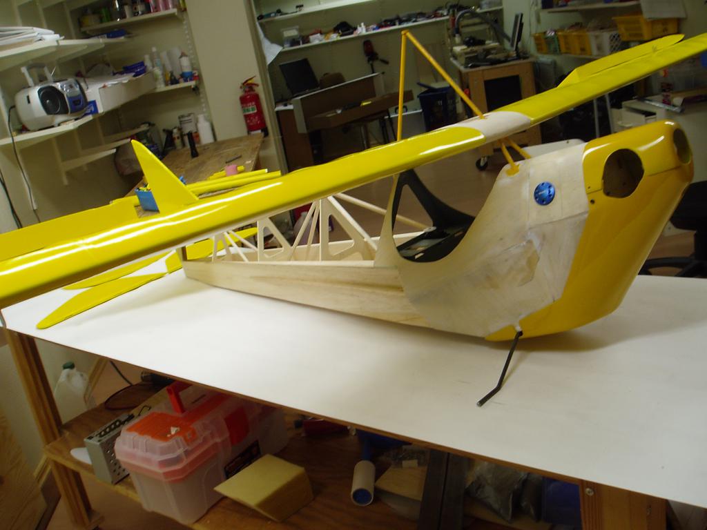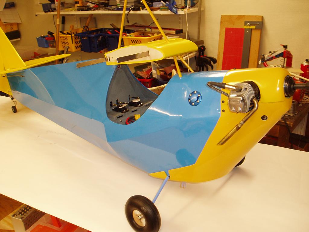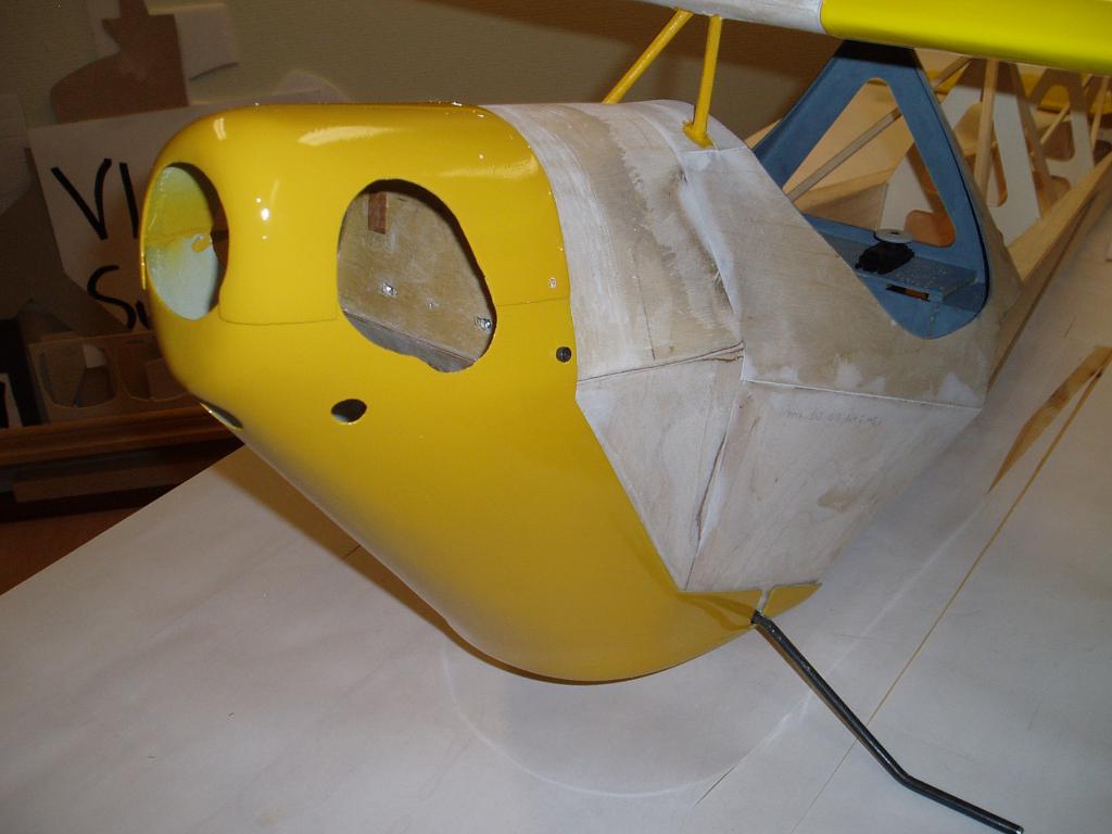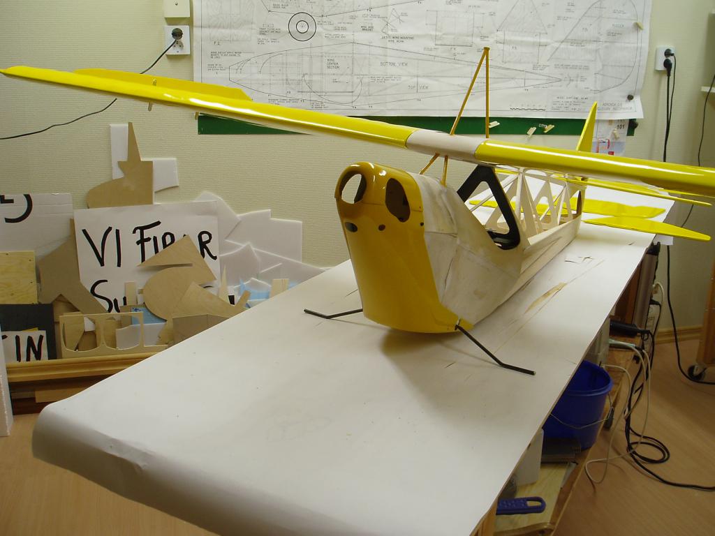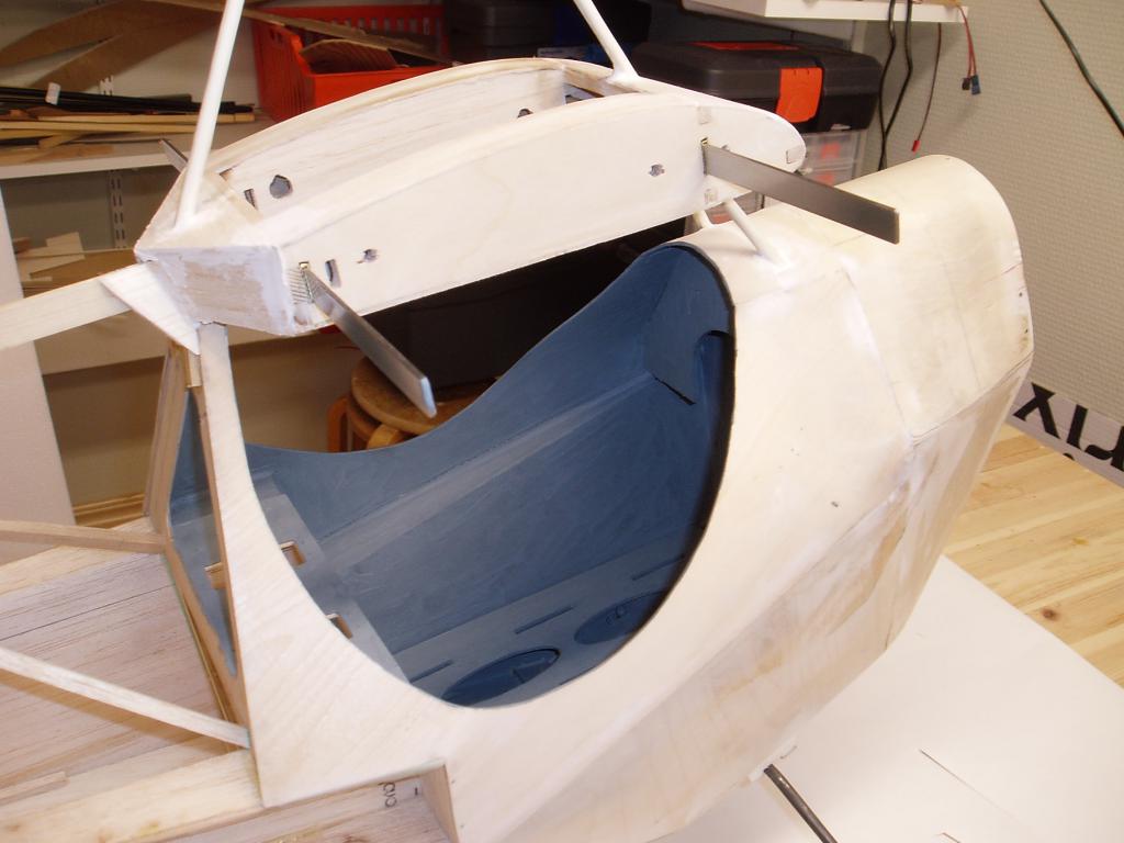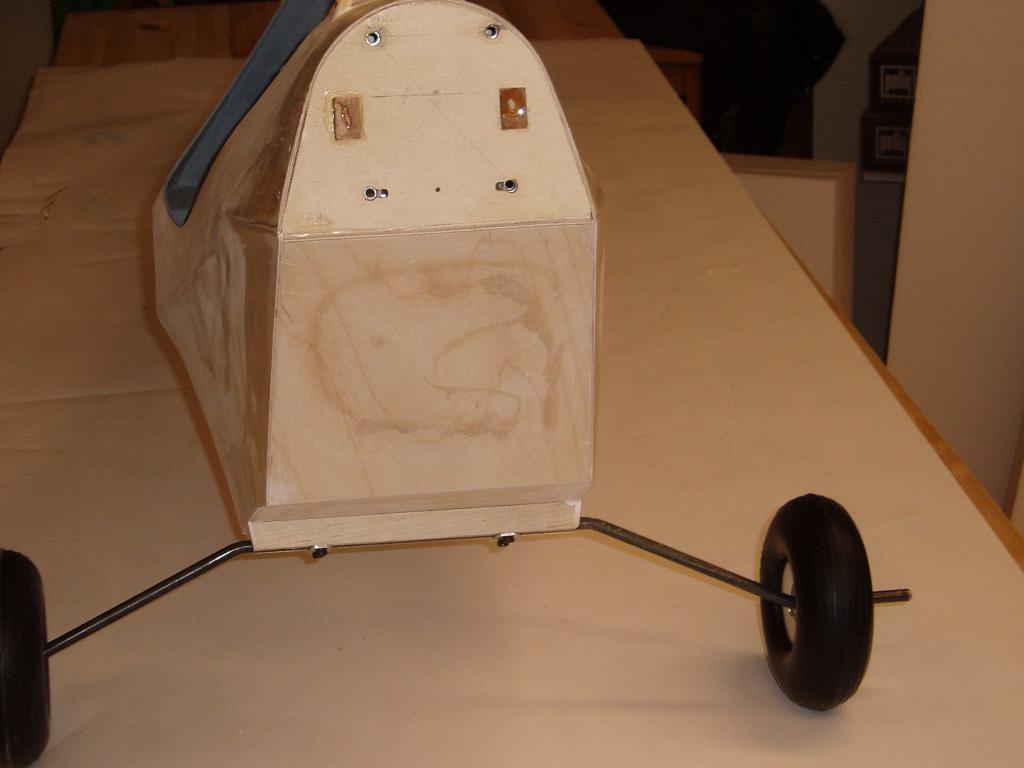 Jag har knäckt till landstället i 6mm pianotråd och monterat ett sporrställ, har också målat sittbrunnen, gjort klart för gångjärnen i skevrodren. Kåporna är klar för målning.