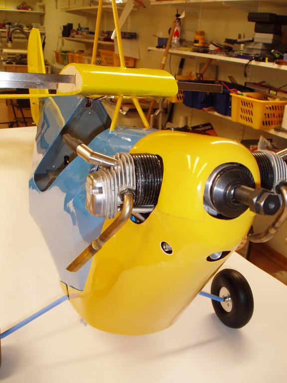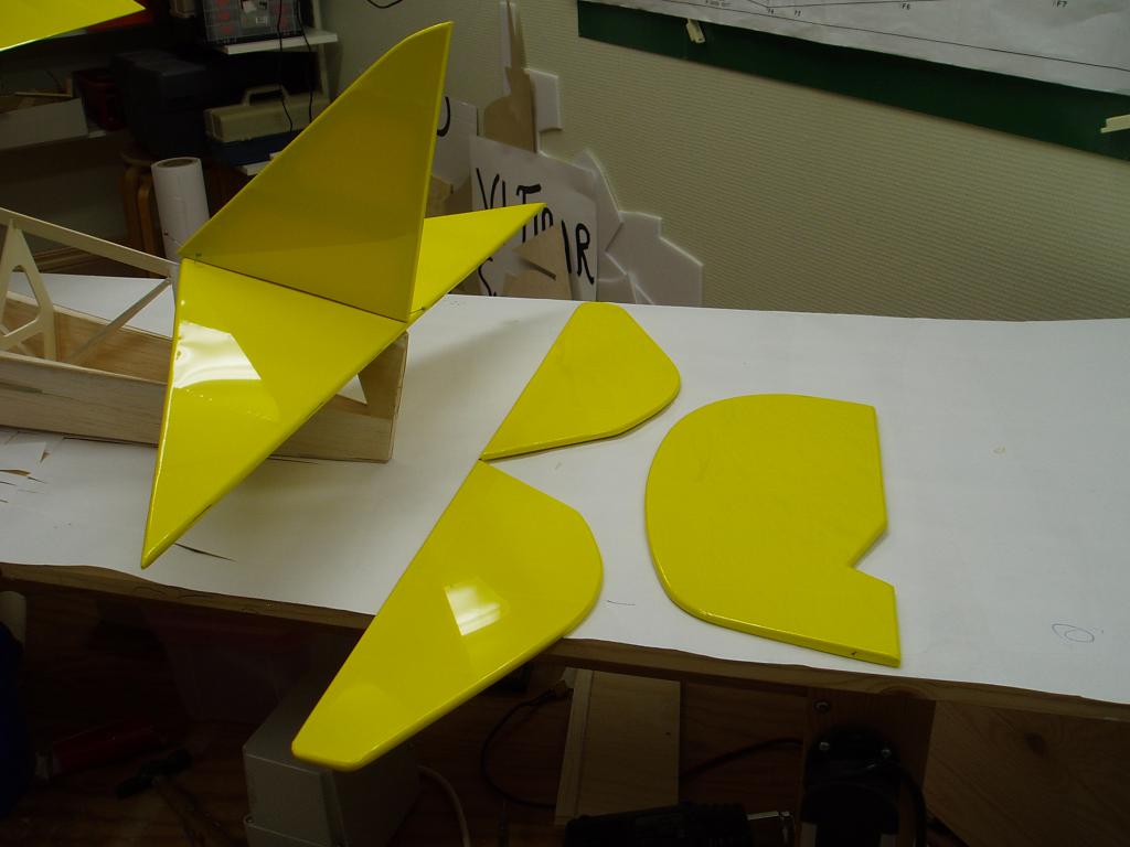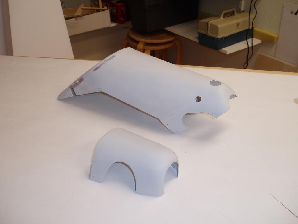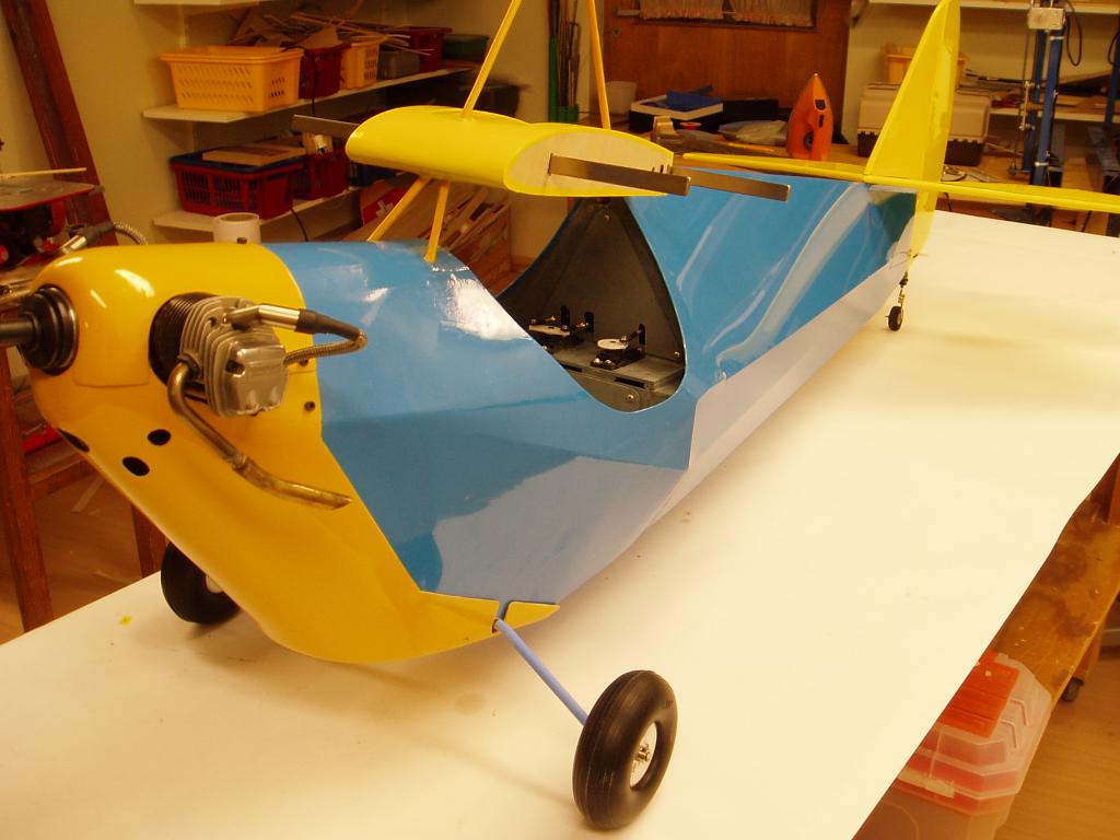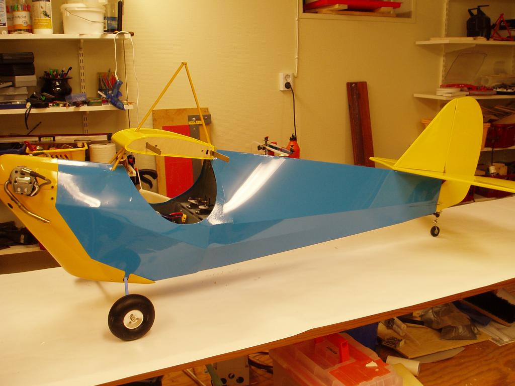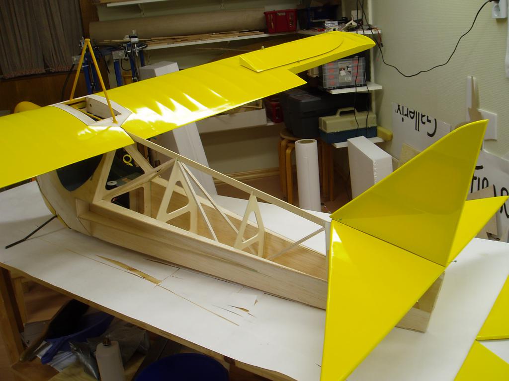Jag har knäckt till landstället i 6mm pianotråd och monterat ett sporrställ, har också målat sittbrunnen, gjort klart för gångjärnen i skevrodren. Kåporna är klar för målning.