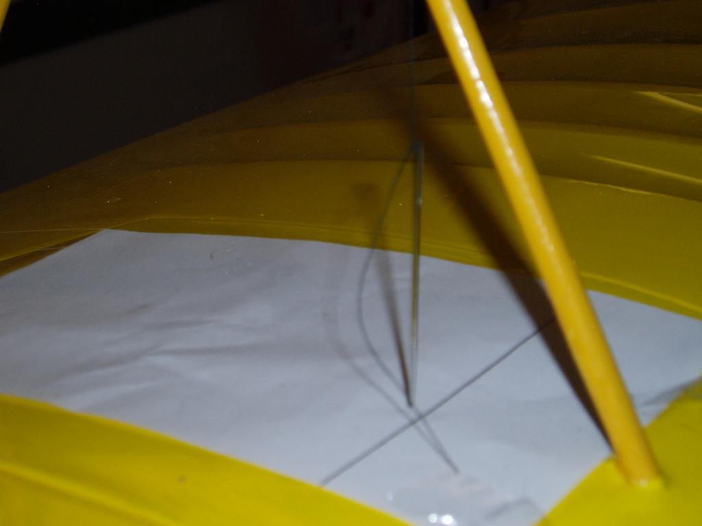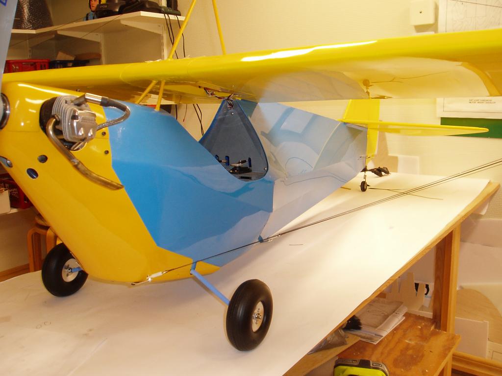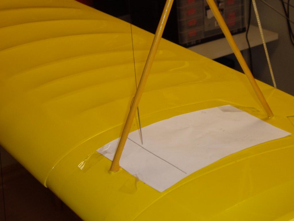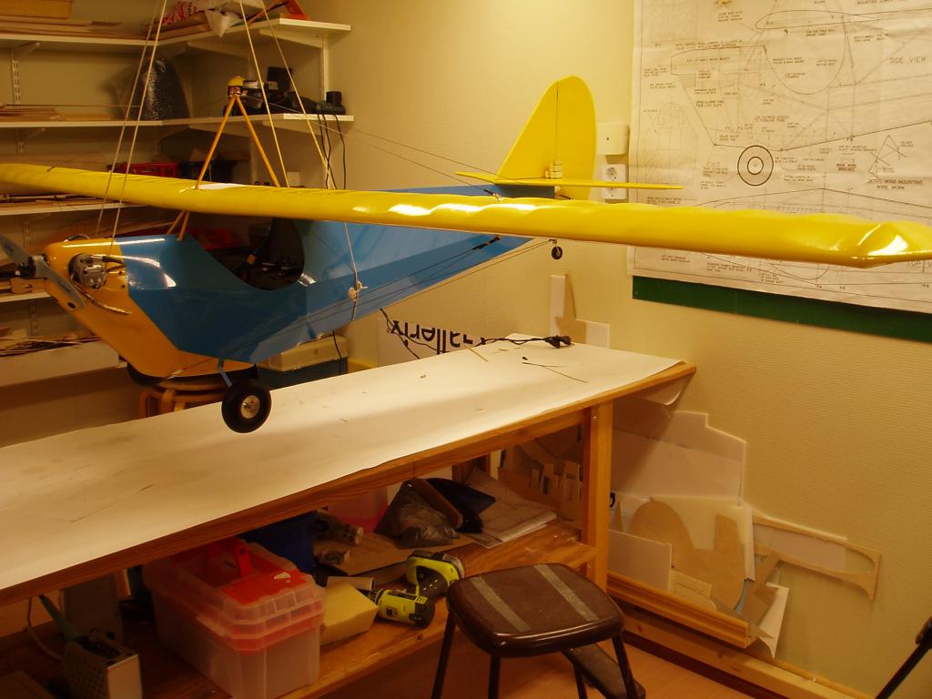Passade på att hänga upp modellen i taket för att väga av tyngdpunkten när vingarna ändå var monterade. Överkanten på bakkroppen är i det här fallet 0-linjen eller datumlinjen som det också heter, det betyder att stabben är monterad utefter övre kanten av kroppen och har 0 grader medans vingen har ca 2 graders anfallsvinkel.