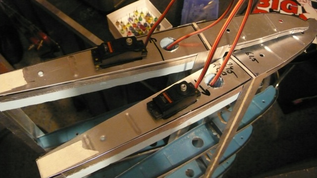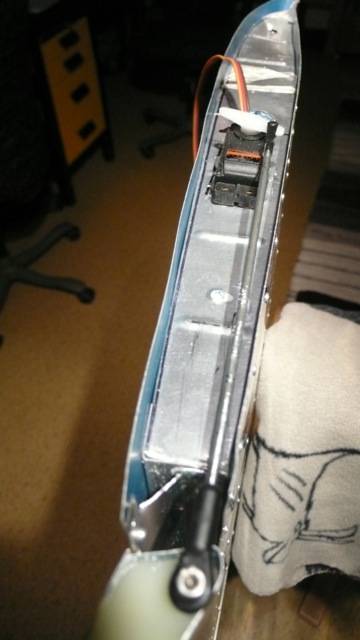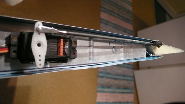 Har nu gjort klart 2 skevroder och en av klaffarna. Det är rejäla klaffar, 90 x 12 cm, men ganska små skevroder. Provmonterat ett servo i vingspetsen för skevroder. Servot och linkage får precis plats inuti spetsen. Kommer att göra den av glasfiber/epoxy utanpå en form av blå frigolit.