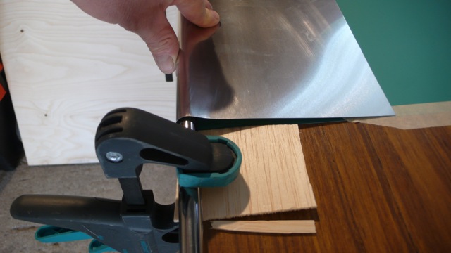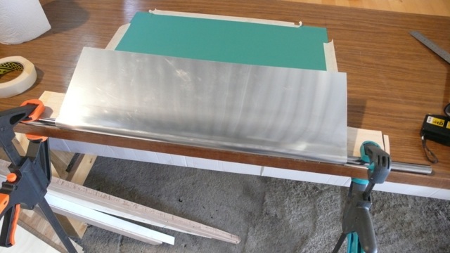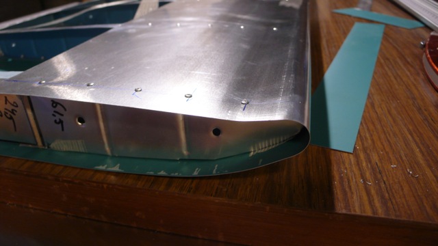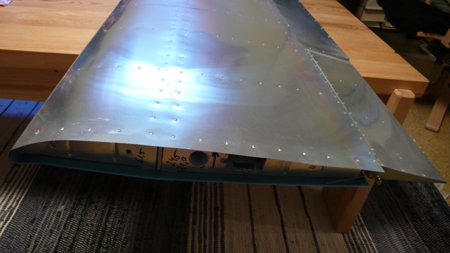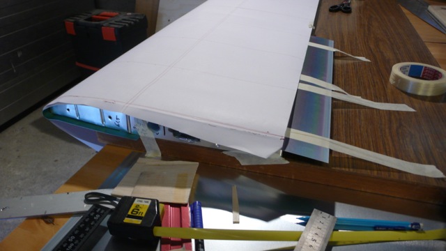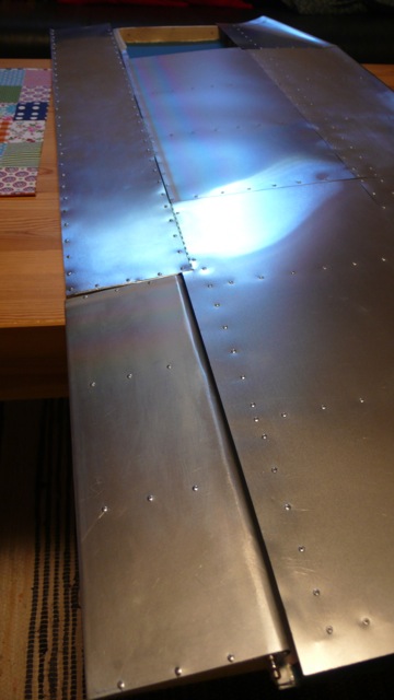 Nu har i alla fall bygget startat upp igen. Nu är det vingarna som skall göras färdiga och här kommer lite bilder. Skelettet var ju klart sedan tidigare och nu har jag bockat till plåtarna till skalet. En enkel bockningspryl gjordes av ett VA-rör med lämplig diameter för att få till nosrundningen. Röret spändes fast med ett tunt mellanlägg av balsa för att precis kunna skjuta in alu-plåten mellan röret och arbetsskivan. Viktigt med en helt rak skiva som underlag för att kunna behålla plåtarna plana under bockningen.