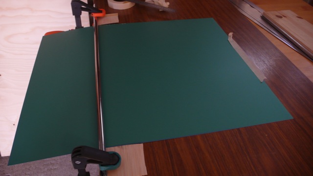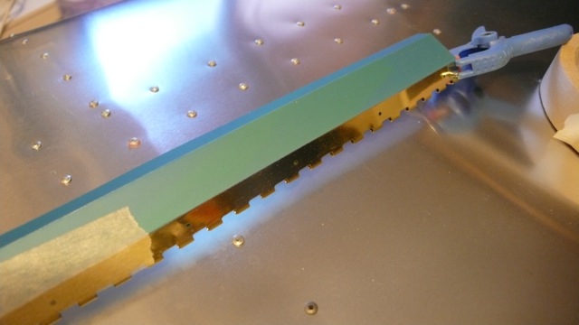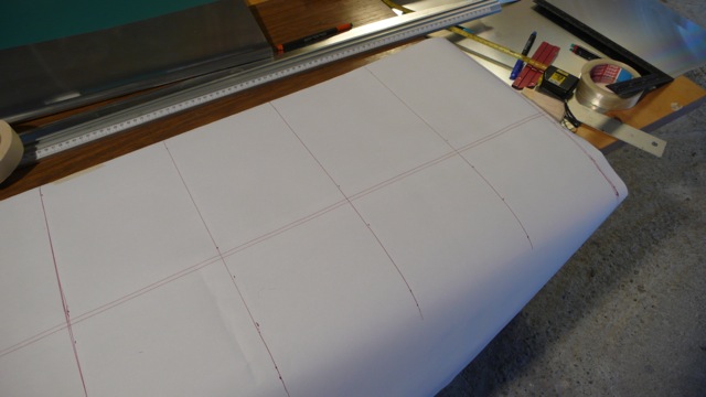 För att få spryglarna att hålla sig raka under plåten tejpade jag dom med armerad tejp. Tejpen få sedan sitta kvar under plåten. Det finns ingen nosbalk så därför behövdes tejpen för att hålla spryglarna i position så att det skulle gå att hitta dom vid borrning för nitarna. För att veta var borrhålen skulle placeras gjorde jag en mall av vanligt vitt papper. Tänkte använt smörgåspapper som är lite halvgenomskinligt men det var slut så det fick bli så här i stället. Efter att plåtarna lagts på plats och fixerats med maskeringstejp lades borrmallen på och några spridda nitar sattes igenom papperet så att bitarna inte skulle rubbas. Borrade så alla hålen genom papperet och tog bort det och nitade resten.