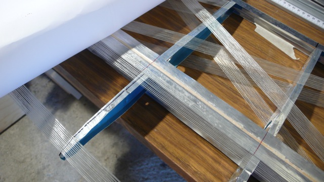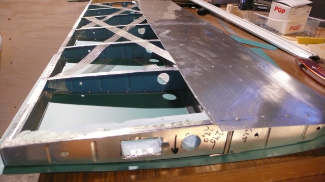 Gjort plats för skevservon i yttersta vingspryglarna. Servona kommer att sitta inuti vingspetsarna som blir av epoxi med glas- eller kolfiber. Under den tunna alu-sprygeln finns en blå cellplast-"sprygel" som har en plywoodram infälld runt servot så det finns något att skruva i.