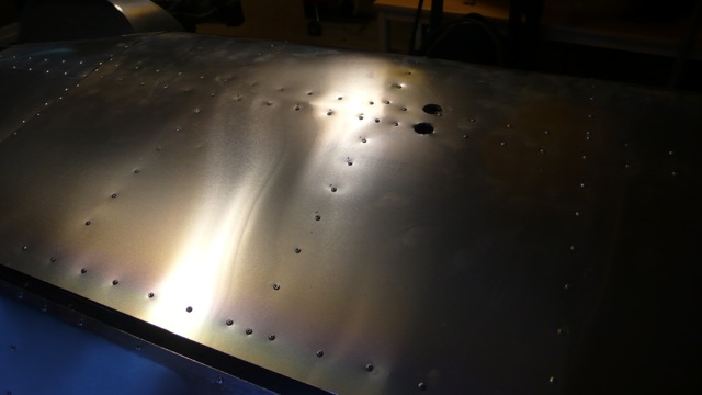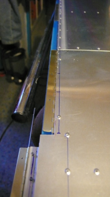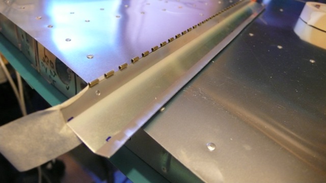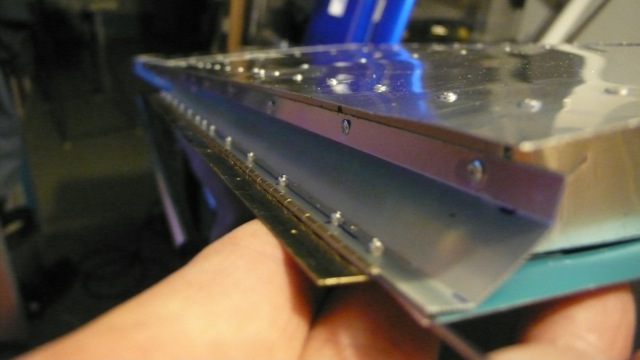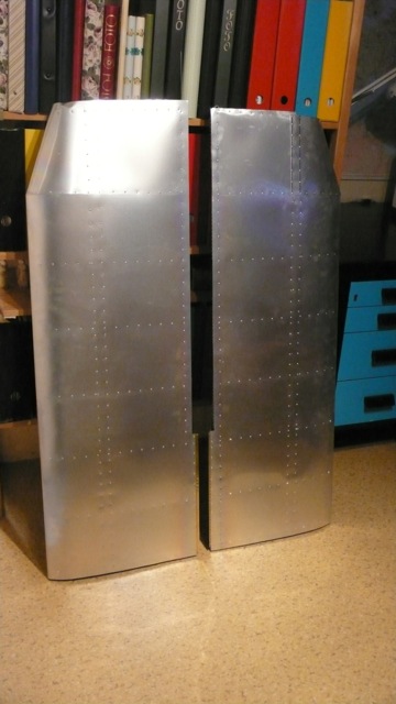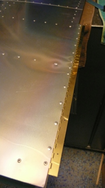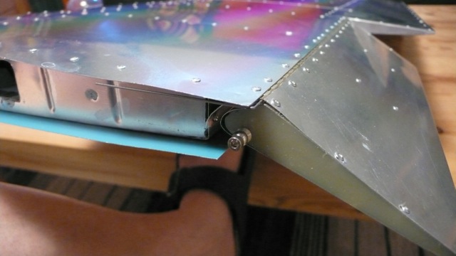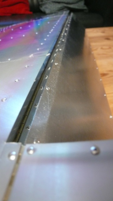 Mera nitar...Har nu passerat ca 2500 st men då sitter också gångjärnen för skev och klaff på plats. Klaffen är hängd i underkant och skevrodret i överkant. Vingbakkanten har ett ganska långt utstick där skevrodrets gångjärn sitter och där behövs en vinklad förstärkning för att styva upp infästningen. Det ser ungefär lika ut på den riktiga MFIn.