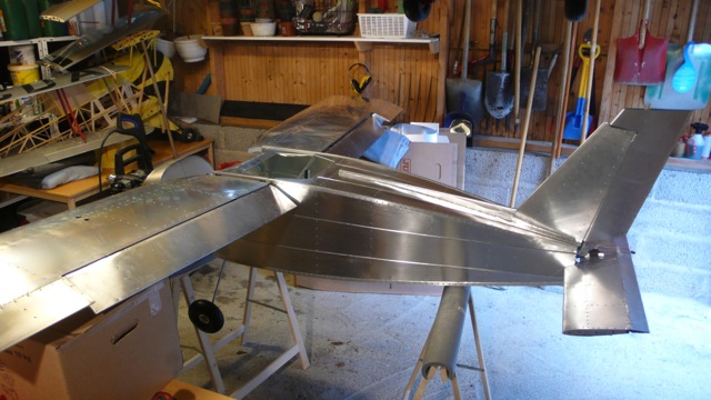 MFIn har nu fått flytta ut i garaget så att det finns plats att provmontera delarna. Har ännu inte vägt den som den ser ut på bilderna men jag tror att den planerade vikten skall kunna hålla. Vikten på en vinge med servon och linkage och roder men utan vingspets är 1940 gram.