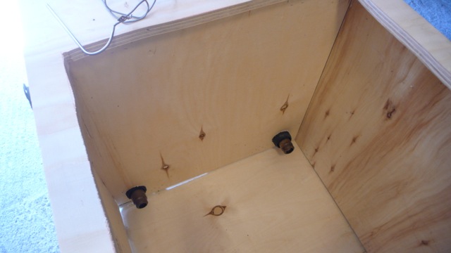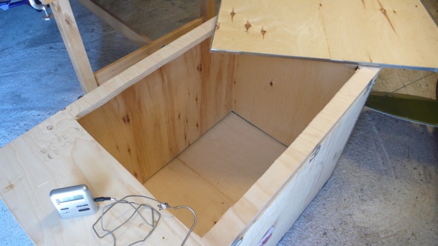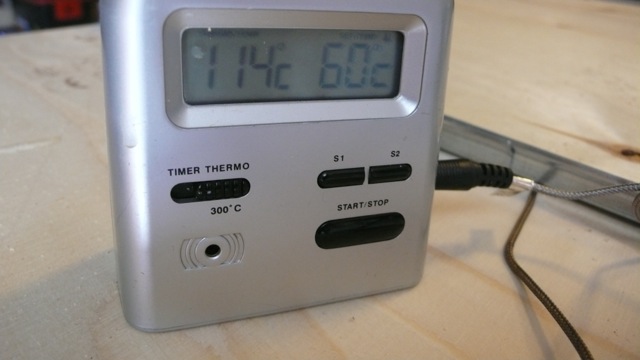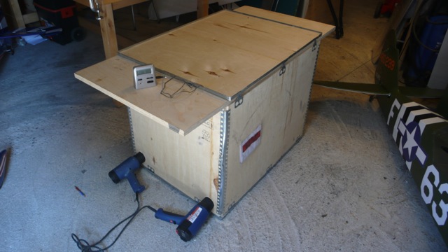 För formningen av PET-plasten har jag byggt en provisorisk "ugn" av en plywoodlåda. Uppvärmningen blir med 2 varmluftspistoler som sticker in genom lådan. Temperaturkontroll med stektermometer "lånad" i köket. Plasten är tänkt att fästas i ramen ovanpå och sedan pluggen på undersidan av en skiva som läggs uppepå och trycks ner i den värmda plasten och så dammsugaren kopplad igenom skivan med pluggen. Om det fungerar?? Vet inte ännu men kanske i morgon....
