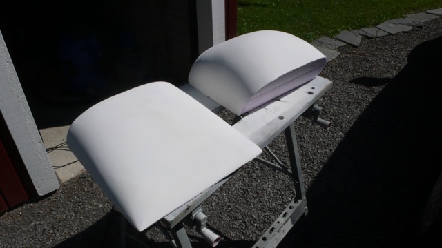 Har också börjat förbereda för dragning av huvarna. Pluggar gjorda i rosa markisolering som skurits grovt med en vass f d brödkniv och sedan slipats till rätt form. Spacklade med väggspackel för att få en porfri yta och lite hårdare yta. Tänker också lägga på ett lager epoxy som avslutning för att få pluggen lite mera hållbar.