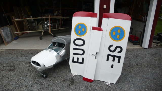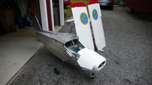 Det som fattas att göra är fästen för motorkåpan, montera radio, servon och stötstänger, klä in bakkroppen och så dubbelkolla anfallsvinklar och så...sen är det dags för provflygning.