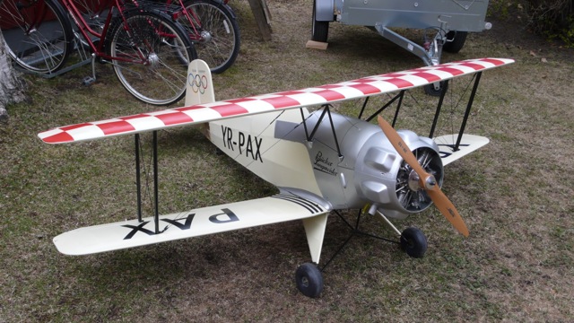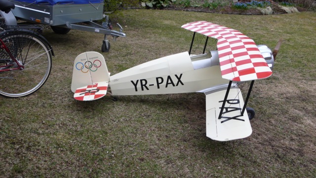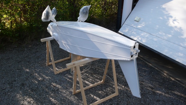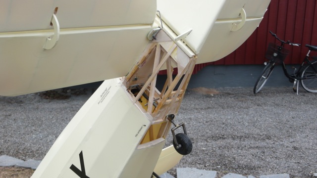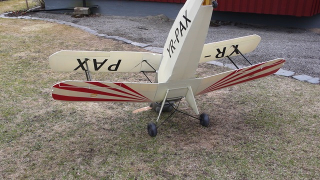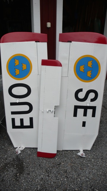 Hej igen, det var ju ett tag sedan det hände något i den här byggtråden... Tänkte kapa min egen tråd och förklara varför det varit så tyst. Orsaken är inte att jag legat på sofflocket utan jag har jobbat med ett litet "sidoprojekt" som skymtat i bakgrunden på en del av bilderna på MFIn. Det är alltså den Bücker Jungmeister jag renoverat. Köpte den nästan färdig av en mycket duktig byggare (Tack Rune Petersson för bra byggjobb!) och då var den gul som Jungmeistrar ofta är. Det fanns dock ett målningsschema som jag gillade mycket bättre så efter lite funderande klädda jag av den gula kostymen, modifierade stjärten så att den blev avtagbar vb för transporter, klädde om den med Solartex och målade den i mitt favoritmönster. Den är nu nästan klar och provmonterades idag. Det visar sig att allt passar, tyngdpunkten hamnar på rätt ställe och vikten blir 18 - 19 kg. Helt OK vingbelastning med tanke på storleken.