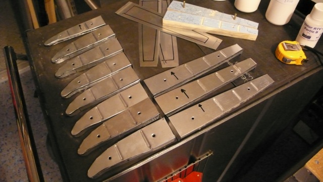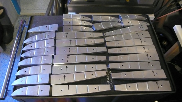 Lite mera spryglar....nu är alla klara och nästa blir att tillverka vingbalkarna. I-balk i mitten och U-balk i bakkanten. Skevservot kommer att sitta på utsidan och igenom yttersta spantet och flapservot på motsvarande sätt i rotspantet. Skevservot blir åtkomligt genom att vingspetsen blir avtagbar och flapservot kommmer att var åtkomligt när vingen är demonterad.