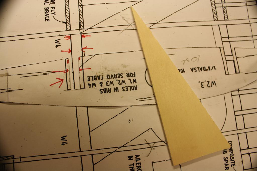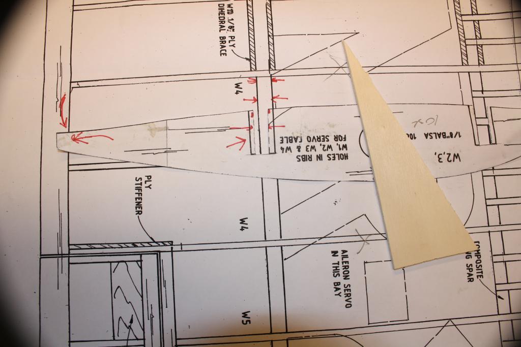 En del kroppsspant är färdiga och ligger i träda tills vidare. Nu återstår det bara att försöka få ihop spryglarna till vingen så att dom passar ihop med varandra. Det låter kanske inte så svårt men Traplet-ritningar har den något otrevliga egenskapen att, som jag tidigare berättat om vid Stampe-bygget, alla mått och skisser mm aldrig stämmer riktigt överens. Nu har jag bestämt att göra alla spryglarna efter rotsprygelns mått och jag använder nu denna som bas för alla andra spryglar. Om ni ser på bilden, vid pilarna, så stämmer inte längden på sprygeln som är avritad. Uttaget till bakre balken samt avslutet bak mot bakkanten är alldeles fel. Så det gäller att se upp, annars hamnar man onekligen i blåsväder. Jag vet för jag har gjort denna erfarenhet ett par gånger för mycket. Resultatet av min ändring blir nu att vingens korda blir ca fem mm större, något som dock inte kommer att synas på den färdiga modellen.