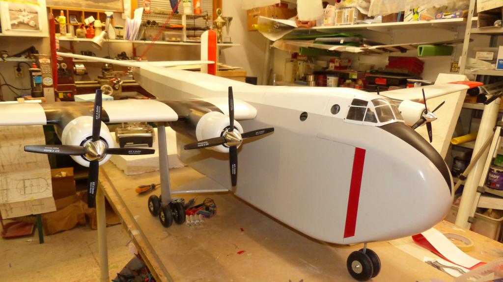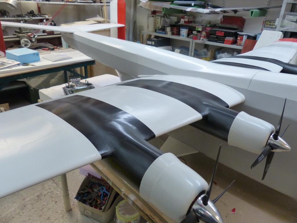 Den väger 6.5 kg inkl. accar. Propellrarna är vanliga master airscrew som jag parat ihop.