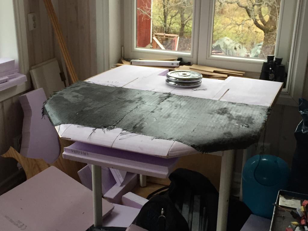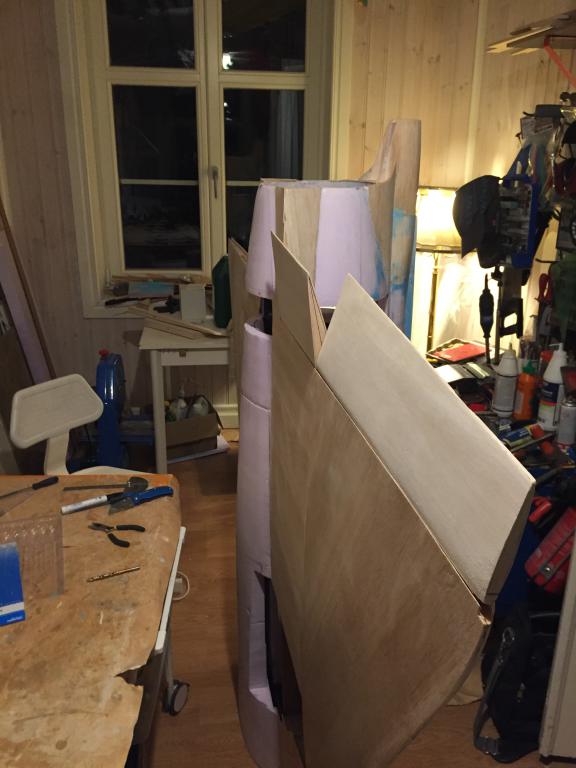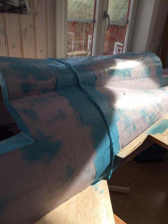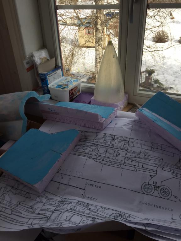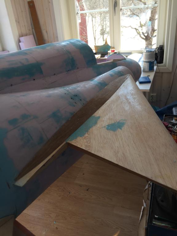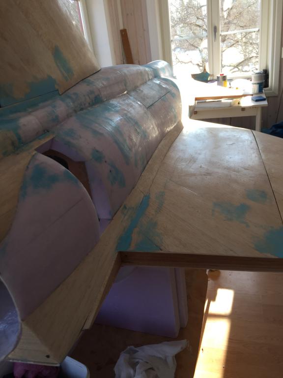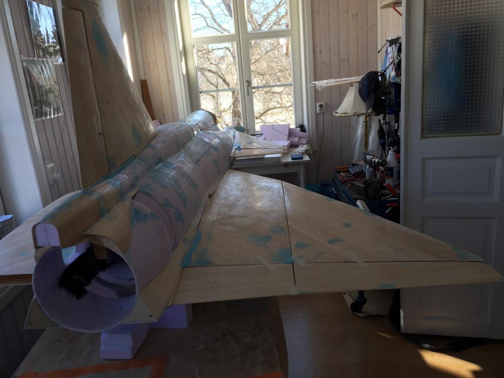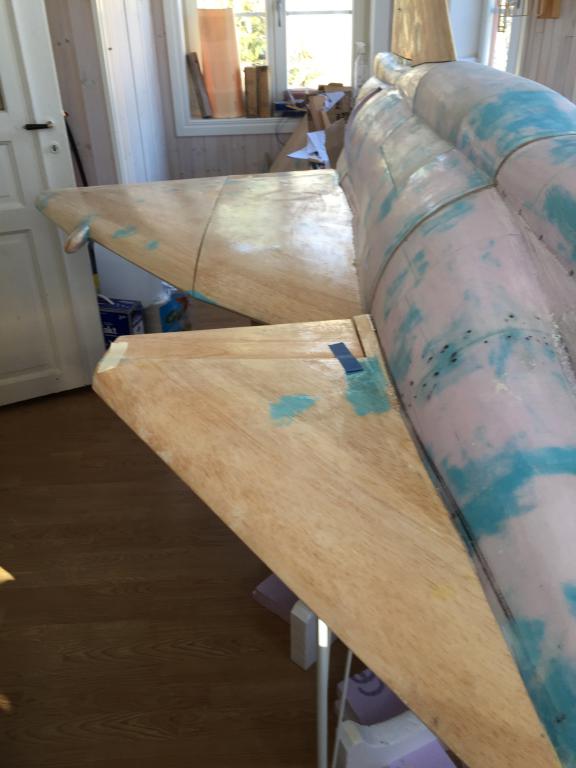 Det går sakta framåt, har gjort mallar avplastskivor för spackling av fogar mellan vingdelar, fena och kroppsdelning och så