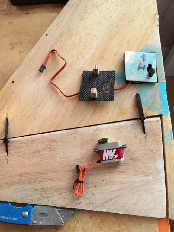 Canarderna får gångjärn och servon provmonterade före canardmontage på kroppen.