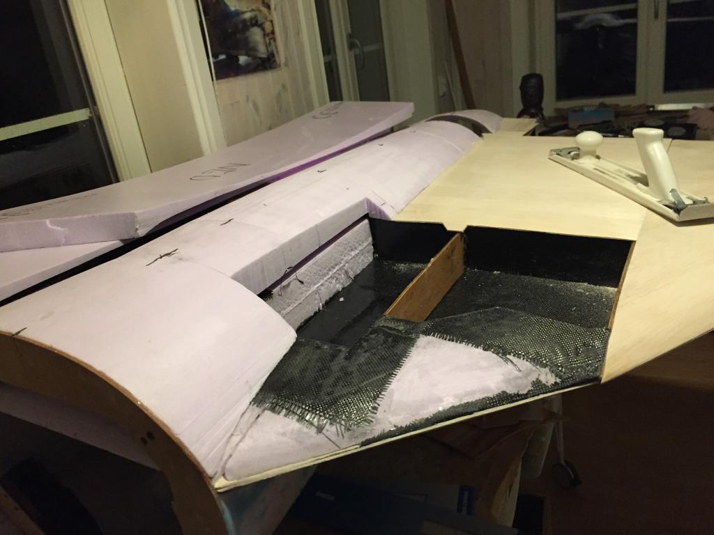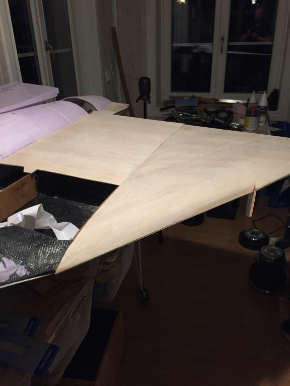 Nu är canarder inmåttade monterade på kroppen, huvudvingen kolfiberförstärkt runt huvudställ och framkant samt monterad och limmad på kroppen. Buken under vingen är monterad och plankning på undersida av vingen pågår. Det skall bli mer kolfiber runt huvudstället innan det är klart med förstärkningen.
