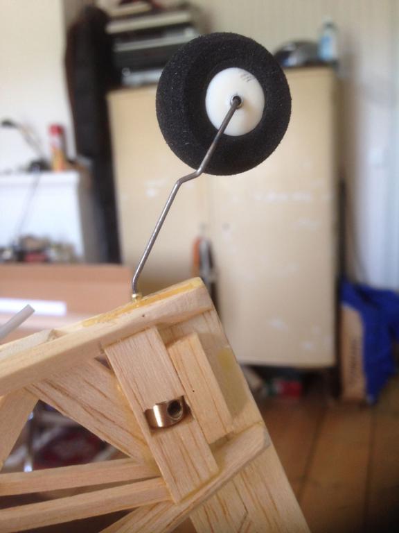 Sporrhjulet på fullskalan är helt friroterande. Eftersom roderytan är stor svänger den lätt med trycket från luftströmmen i kombination med bromsarna antar jag. Första tanken var att följa ritningen som hade sporren sittande på rodret. Bestämde mig dock efter en del velande för att göra även modellens fritt roterande. Dels för att se om det är möjligt med kontroll på en modell, dels för att ritningens roder är ganska vekt och knappast skulle hålla i längden. Fick förstärka lite och få in ett par bitar mässingsrör för att hålla hjulet.