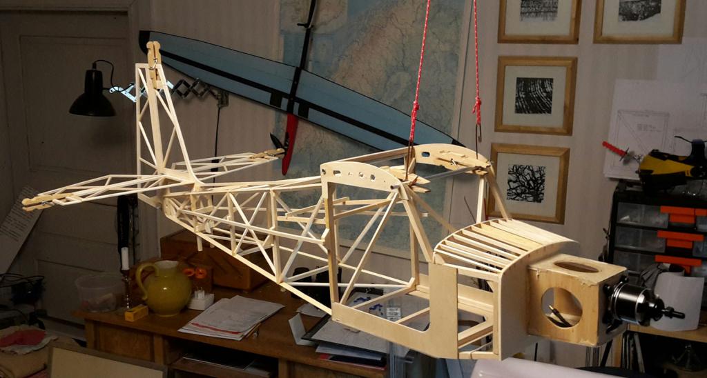 Kroppen fram till brandväggen var inget konstigt. Motorboxen enligt ritningen tyckte jag såg konstig ut och jag valde därför att göra en traditionell (?) box. Hade samtidigt med detta caddat fram en noskåpa att 3-D printa med större överensstämmelse med fullskalan än ritningens. Behövde också designa om infästningen av det ganska speciella landningsstället. Löste detta med två tvärgående balkar av tunn plywood med en kärna av balsa. Det är nog denna jag är mest nöjd med på hela modellen. De blev otroligt starka. Mer om stället senare…
